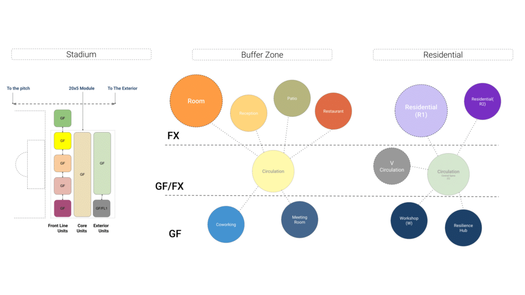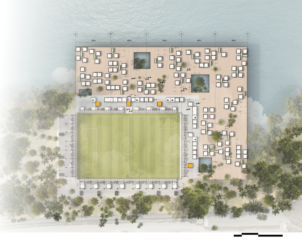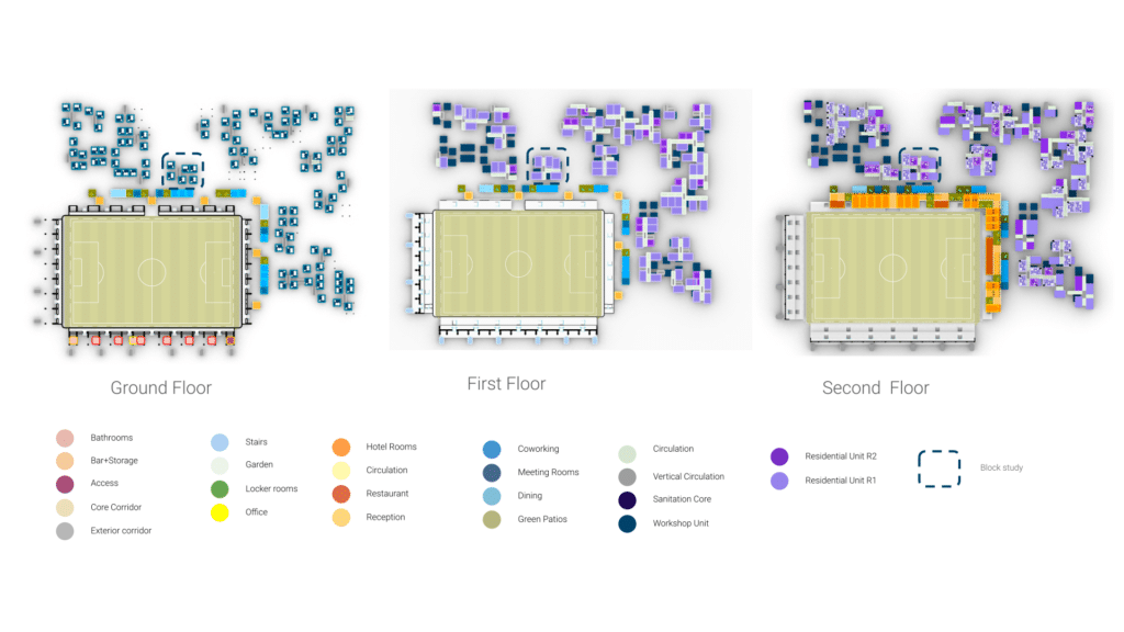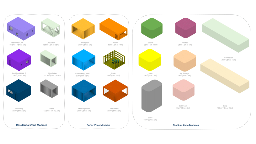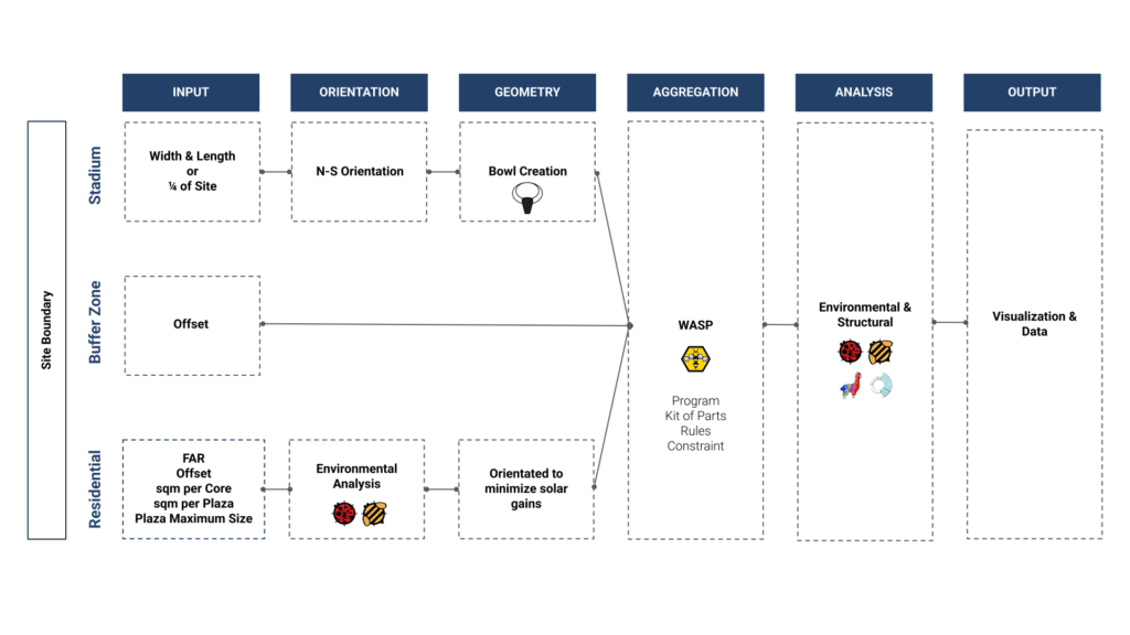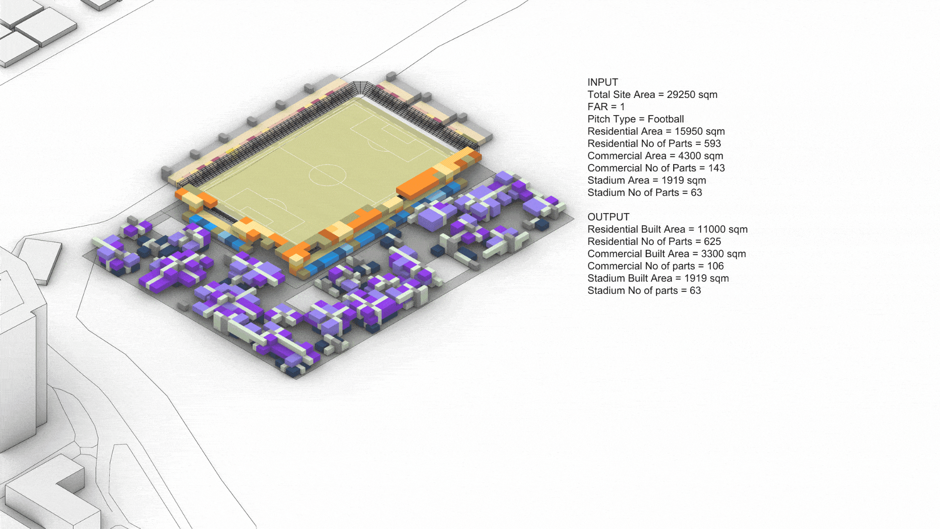 The study revealed that South and East orientations, combined with low window ratios, minimize annual energy loads. These findings directly informed the placement and orientation of the residential aggregation around the pitch.