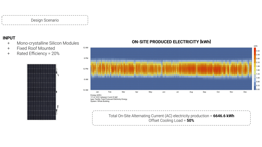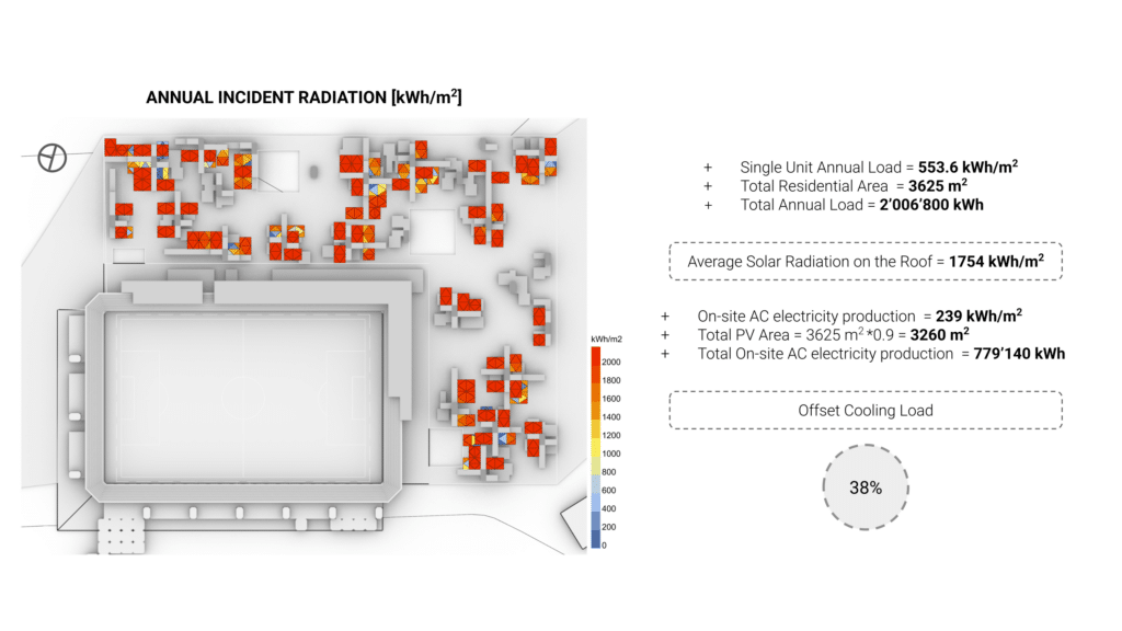To offset cooling demand, mono-crystalline photovoltaic panels were installed on the roofs. When extended to the entire aggregation: