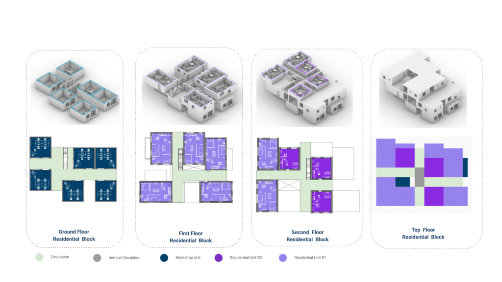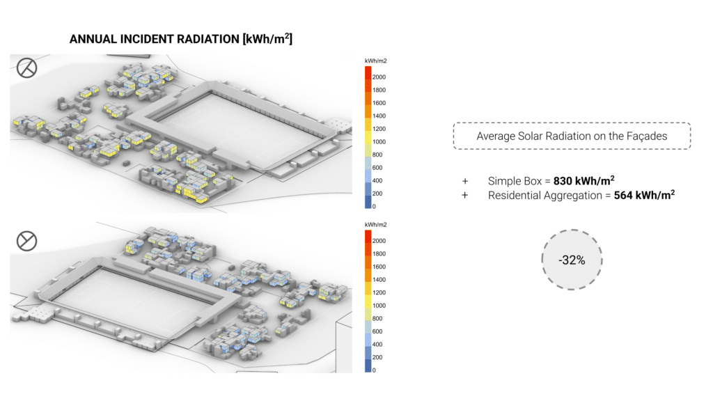 Additionally, façade solar radiation analysis shows a reduction of over 30% compared to a simple box, validating the environmental strategy.