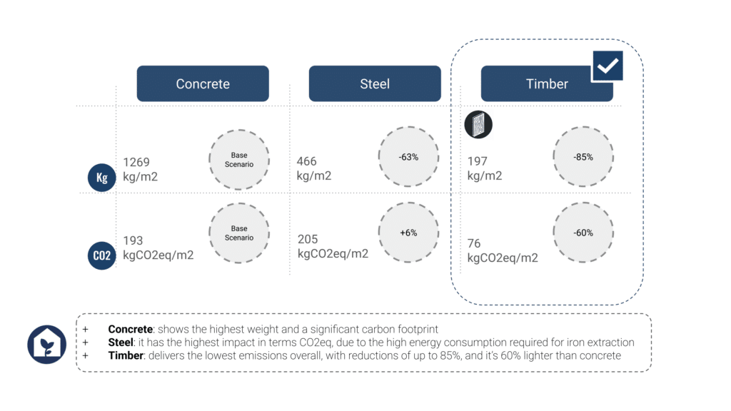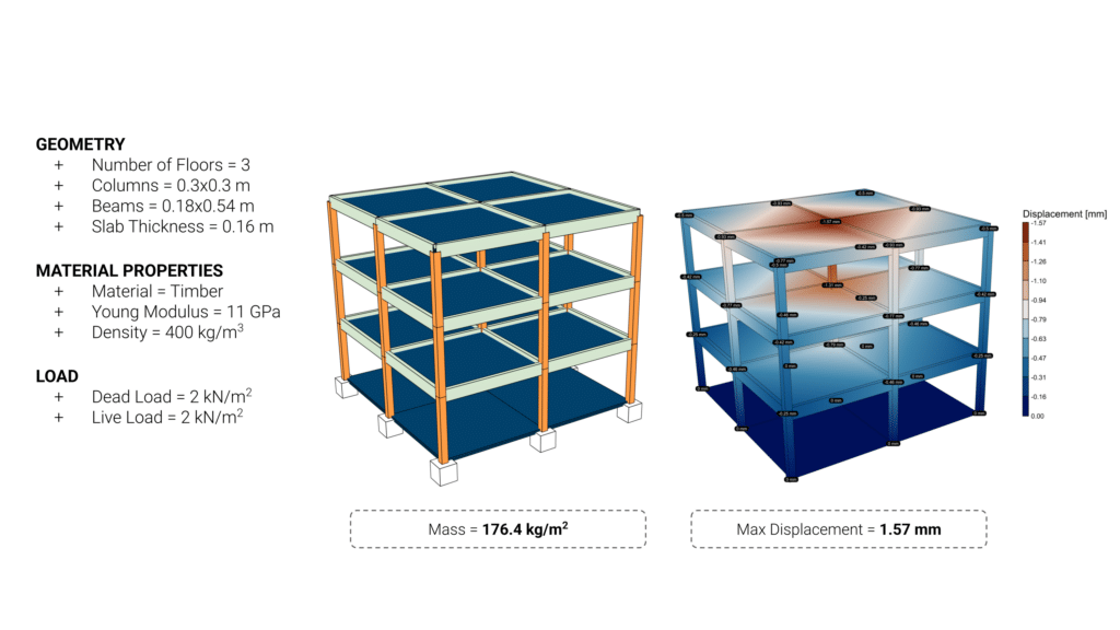 Three structural materials—concrete, steel, and timber—were evaluated based on mass and carbon emissions. Timber emerged as the optimal choice: