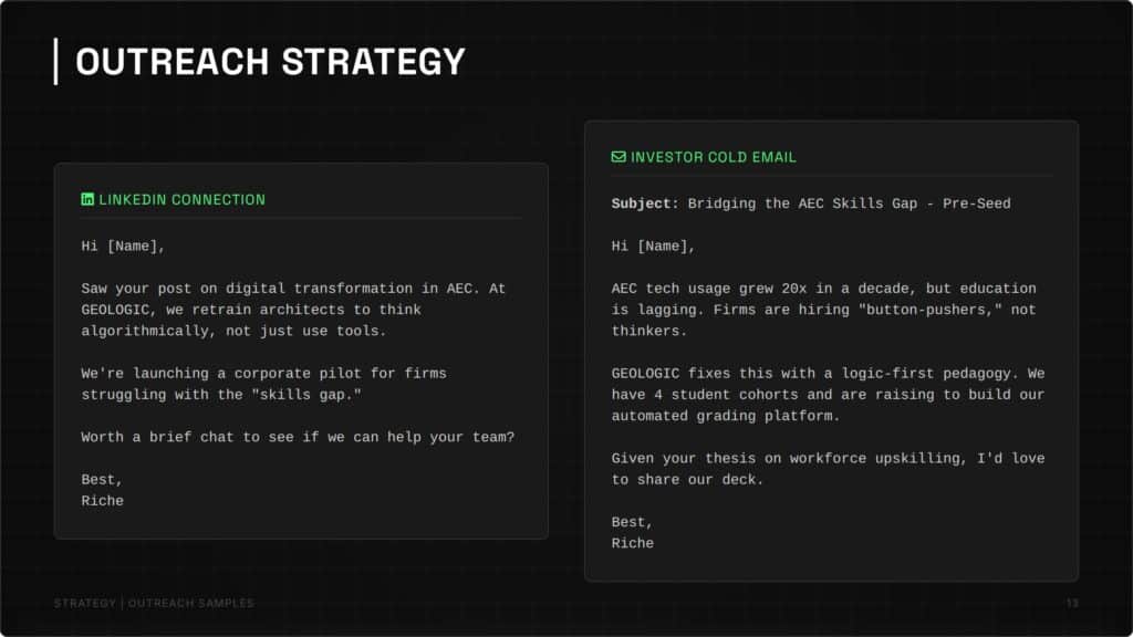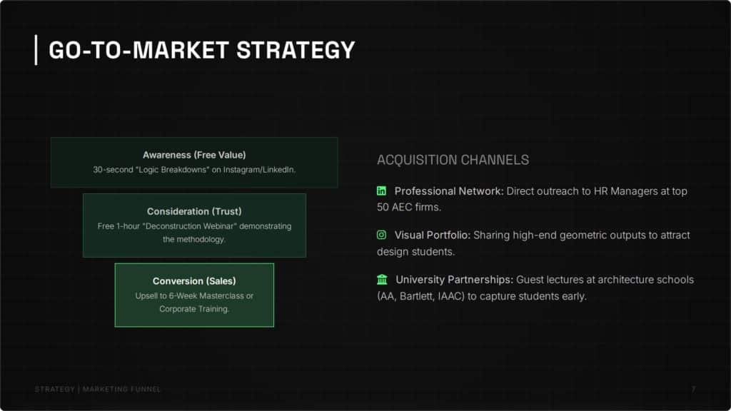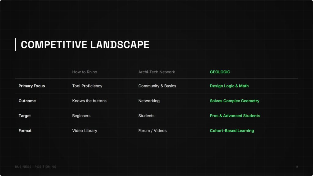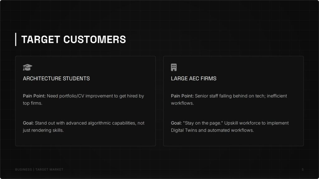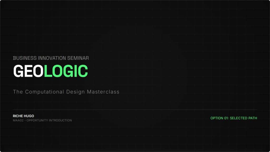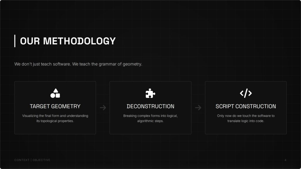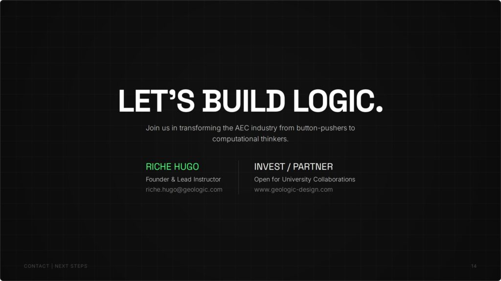 GEOLOGIC addresses this by shifting the focus from mechanical “button-pushing” to true algorithmic thinking. Our unique pedagogy—Target Geometry, Deconstruction, then Scripting—empowers architects to master the logic of complex forms before writing a single line of code. Targeting ambitious students and top-tier AEC firms, GEOLOGIC transforms technical operators into computational designers, ensuring the workforce is future-proofed for the era of complex geometry and Digital Twins.