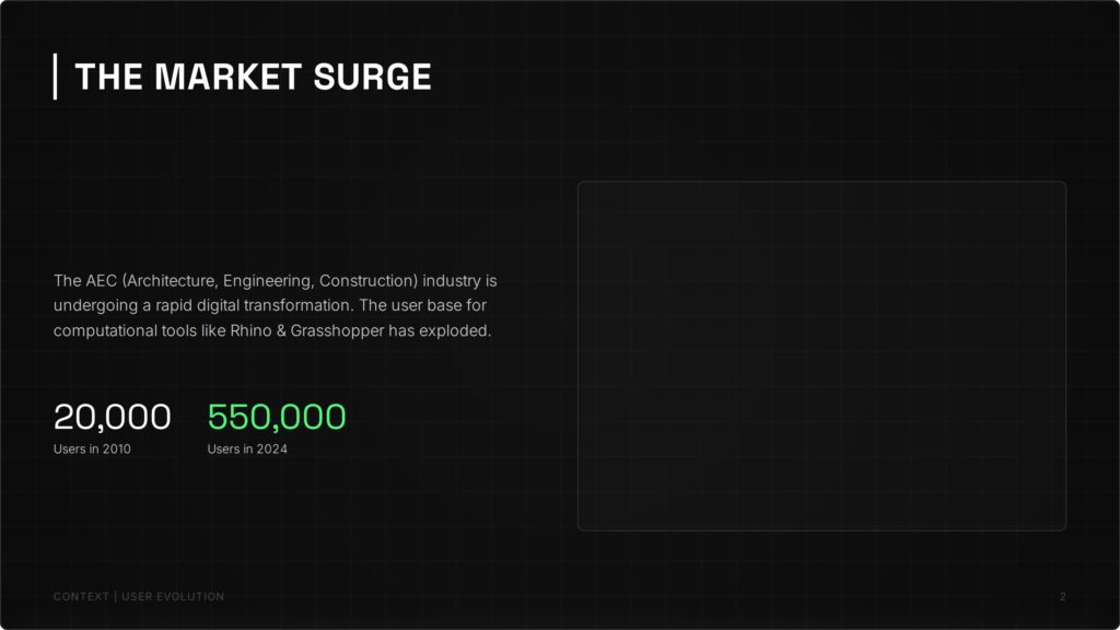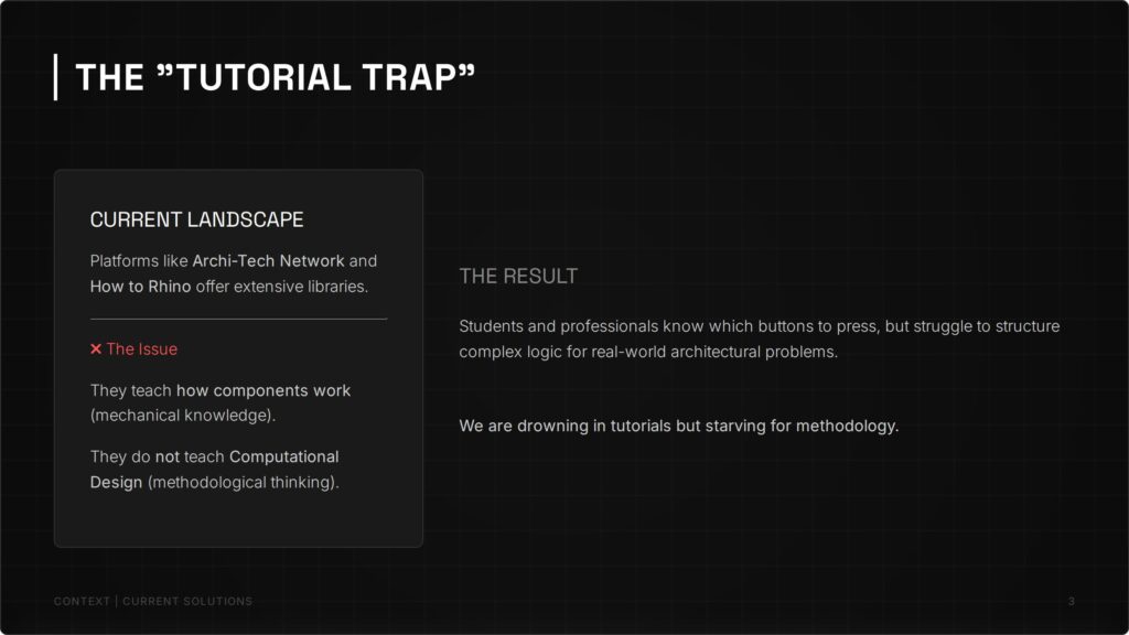 The AEC industry is rapidly expanding, with computational tool users reaching 550,000 in 2024. However, a critical skills gap persists: professionals are drowning in software tutorials but starving for design methodology.