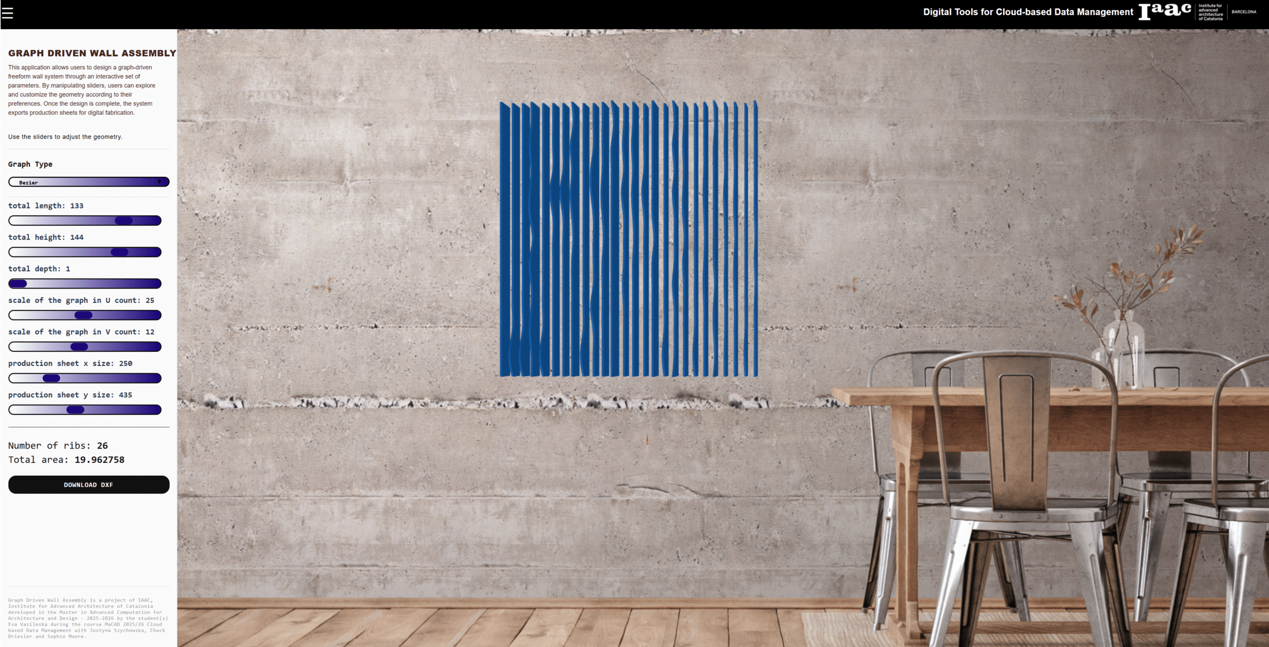 This project presents the development of a web-based parametric configurator for a graph-driven freeform wall assembly system. The project integrates Rhinoceros 3D, Grasshopper, and Rhino Compute with a Vue.js frontend to create an interactive design tool that allows users to explore, customize, and export fabrication-ready geometry through a browser interface. By connecting computational design logic directly to a live web application, the project demonstrates how parametric architecture can be made accessible, interactive, and directly linked to digital fabrication workflows — from concept to cutting sheet in a single browser session