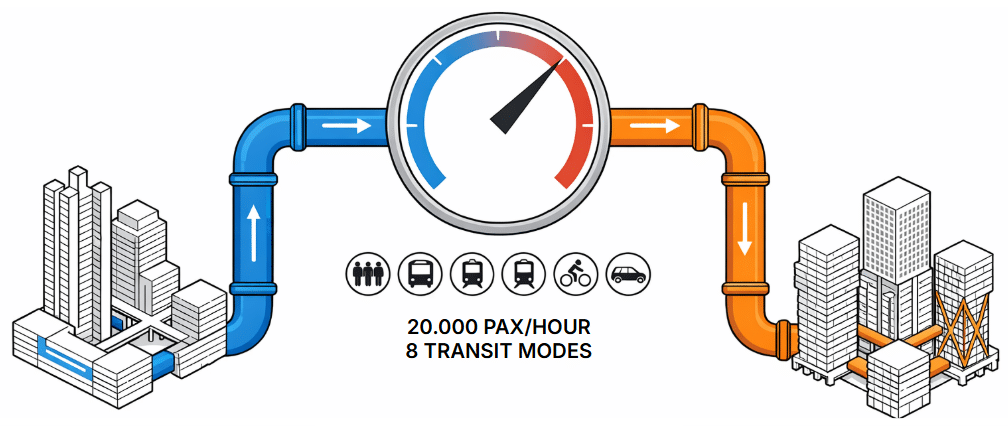 - Mobility Efficiency: We track passenger throughput density to ensure it remains between 3–5 users/m², preventing congestion in the primary arteries.