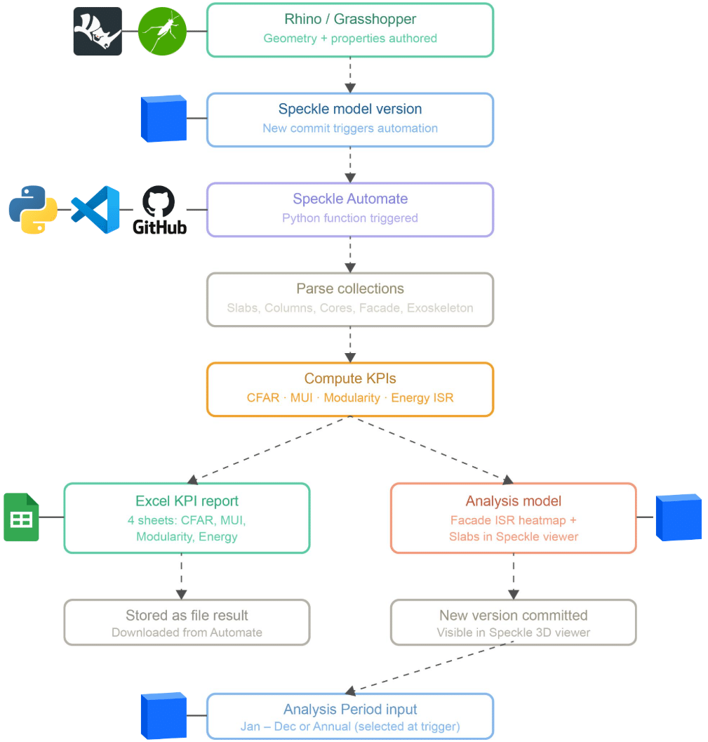 The workflow for HB02: The Heart was anchored by a custom-built, real-time data pipeline designed to bridge the gap between complex geometry and actionable performance metrics. By integrating Speckle as our central coordination engine, we transformed the traditional design process into a dynamic, feedback-driven ecosystem.