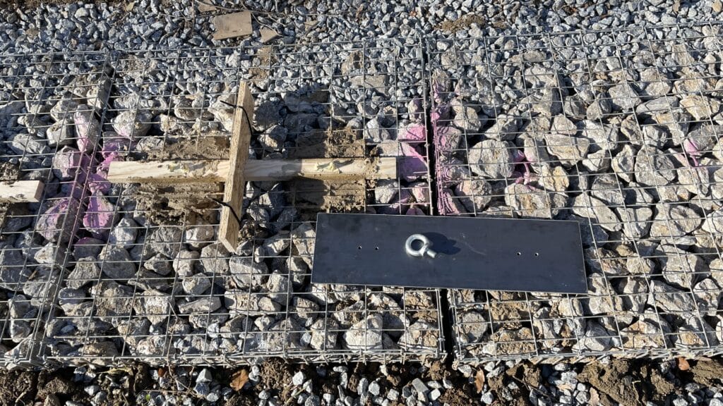The foundational gabion system across our site consists of 1m x 1m x 50cm units, each equipped with two embedded 16mm steel cables. To address the misalignment between the gabion cables and the intended attachment points for the tensioning wall cables, a metal distribution plate was installed on top of the gabions, attached to the cables with heavy-duty u-bolts. The distribution plates were then drilled in the exact location of the cable connections and eye-bolts were secured, protected by the aforementioned PVC tube assemblies, with horizontal access holes at the bottom of the plinths. These assemblies are designed to counteract the wind lift on the roof with up to 500 kg per cable.