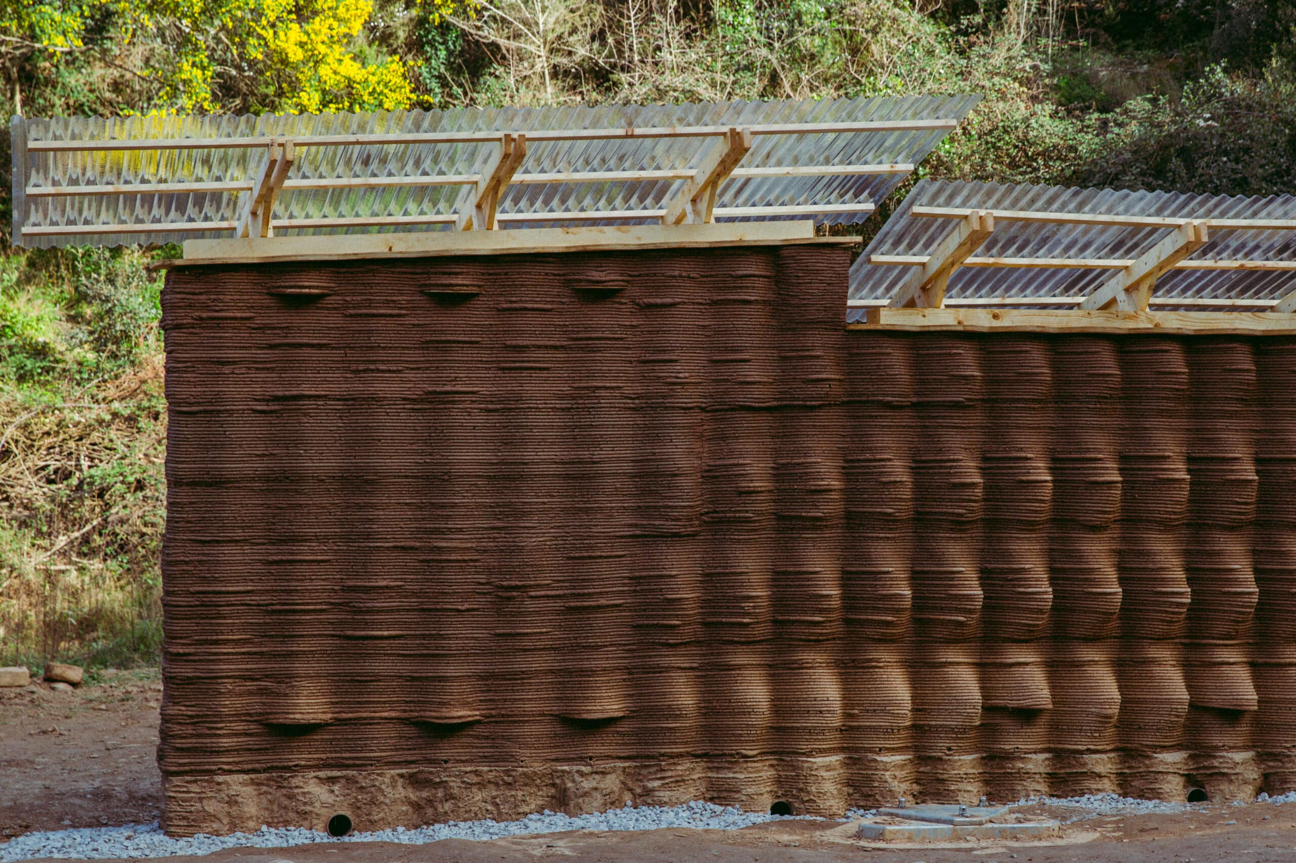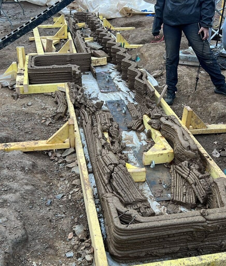 Reusable rock gabions were used as foundations for the two walls. A “plinth” or footing of poured concrete was constructed on top of the gabions to create a waterproof structure in contact with the ground. The plinth was constructed by 3D printing a formwork from the same earth that the walls are printed with, where the concrete would be cast. Before casting, a rebar lattice of 20cm by 20cm cubic cells was installed together with the PVC tube assemblies used to create cavities for the installation of the tension cables.