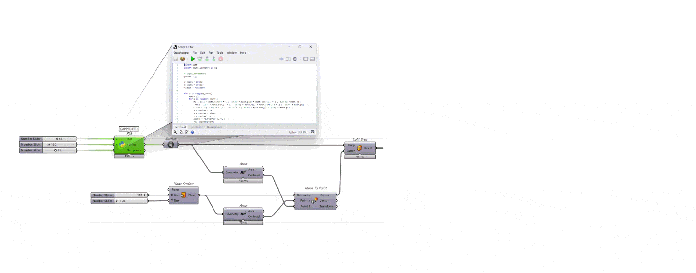 Sourcing the parametric equations (a way of defining a shape using mathematical variables) for Cappelletti pasta from the book Pasta by Design, students Ahmad Baltaji and Emilie El Chidiac used a Python script within the Grasshopper visual programming environment to generate a 3D model. However, they didn’t just enlarge the formula. In a key act of practical design, they cut and scaled the shape to fit within an 8x8x6 meter bounding box, ensuring the spatial flow made sense for human experience. To give the surface its structural bones, they then used a tool called Crystallon to generate an initial lattice structure, creating the pavilion’s wireframe skeleton.