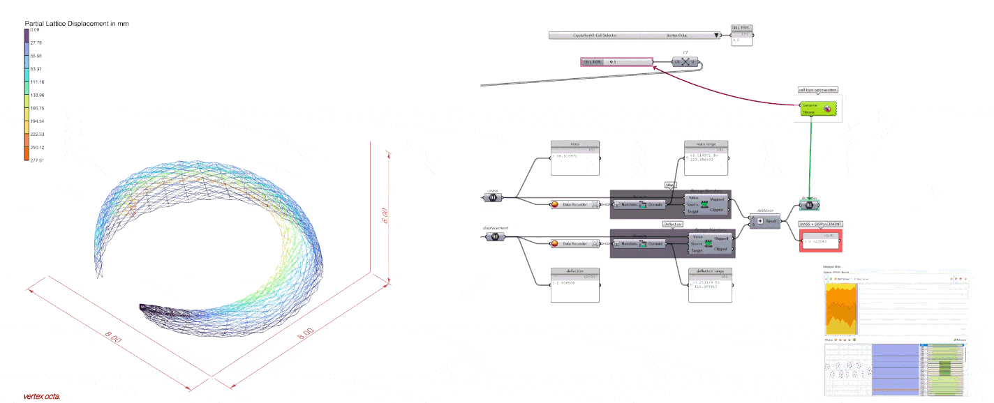 The solver discovered that the forces acting on the outer shell were best handled by a lattice with a “vertex octa” topology. The inner shell, however, required a completely different “edge octa” configuration to achieve the best performance. This is a prime example of computational design uncovering non-intuitive solutions that would be nearly impossible for a human to intuit. It’s a powerful demonstration that a one-size-fits-all approach is often inefficient, and that even within a uniform object, different areas have unique structural needs that demand tailored solutions.