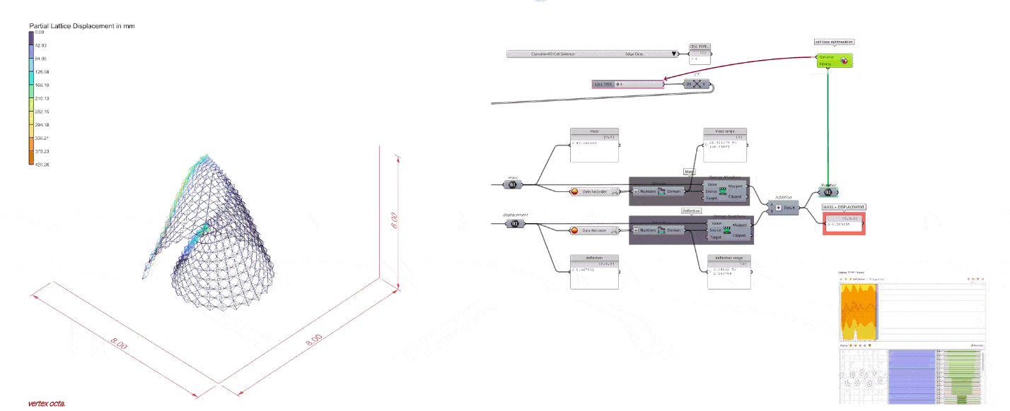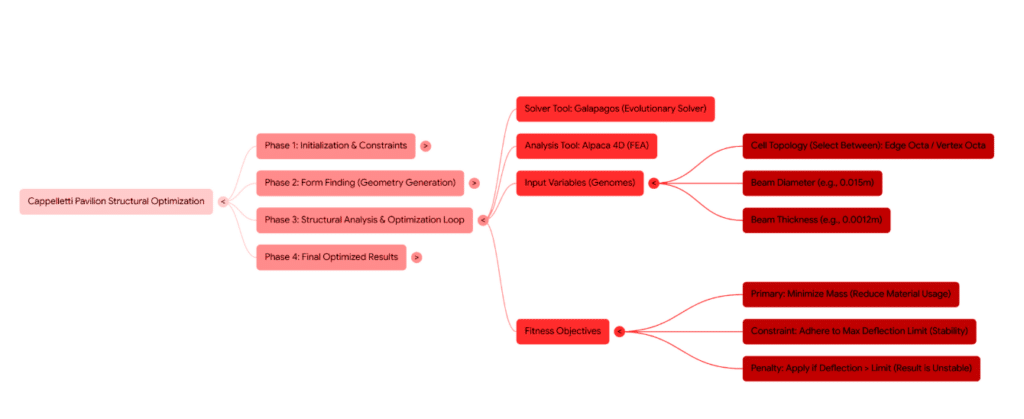 Using a tool called Galapagos as the “evolutionary solver” and Alpaca 4D for Finite Element Analysis (FEA, a method for simulating physical forces on a digital model), the system tested countless structural variations. The objective was clear: ensure stability while minimizing material usage. The solver was allowed to mutate three core “genomes” of the design: the cell topology (the geometric pattern of the lattice), the beam diameter, and the beam thickness. This method allows a computer to explore a vast landscape of potential solutions, often discovering highly optimized and non-obvious designs that a human might never conceive of through traditional methods.