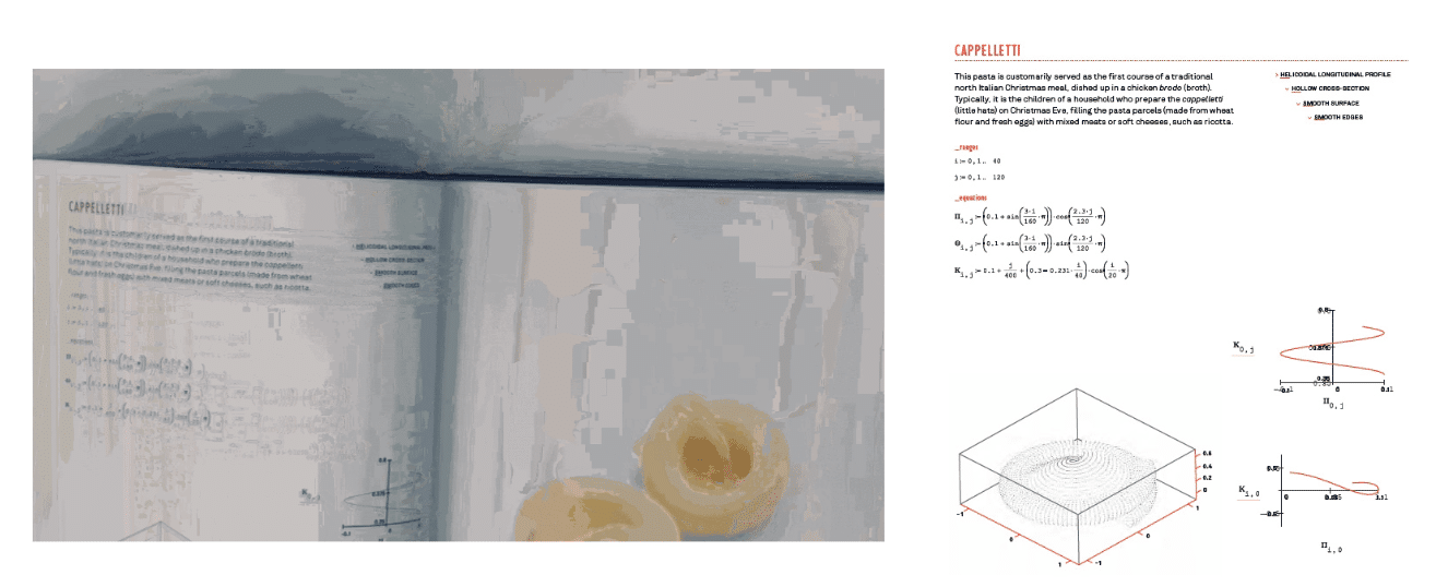 The Cappelletti Pavilion project began not with a sketch, but with a recipe. In the initial “Backstory” and “Form Finding” phases, the goal was a “direct digital translation from plate to pavilion.” The idea was not to simply be inspired by the pasta’s shape, but to use its fundamental mathematical description as the starting point for the architectural form.