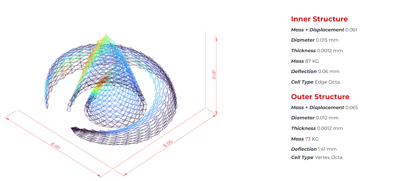 The pavilion is designed to be built from Glass Reinforced Recycled PET, a strong and sustainable composite. The final optimized mass for the entire structure is a combined total of approximately 160 kg—just 73 kg for the outer shell and 87 kg for the inner. Despite this low weight, the pavilion is exceptionally strong. The two-part structural solution paid off: under a simulated load, the outer shell’s maximum deflection (how much it bends) is a mere 1.41 mm, while the more delicate-looking inner shell deflects only 0.06 mm—both well within architectural safety limits. These stats confirm that the process can yield a feasible, high-performance structure that is elegantly efficient in its use of materials.