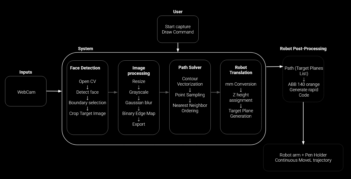 This system defines a seamless pipeline that transforms a simple user action into a continuous robotic drawing. Once the user initiates capture and sends the draw command, the webcam feeds live input into the system, where OpenCV detects the face, selects boundaries, and crops the target image. The image is then refined through resizing, grayscale conversion, Gaussian blur, and binary edge extraction to reveal its essential structure. From there, the path solver translates visual information into geometry by vectorizing contours, sampling points, and intelligently ordering them through a nearest-neighbor strategy to preserve continuity. The resulting path is mapped into robotic space via millimeter scaling, Z-height assignment, and target plane generation. In the final stage, the trajectory is converted into ABB RAPID code and executed as a smooth, uninterrupted MoveL motion by the robotic arm turning digital perception into a fluid physical trace without ever breaking the line.