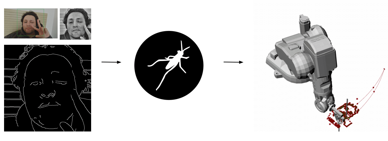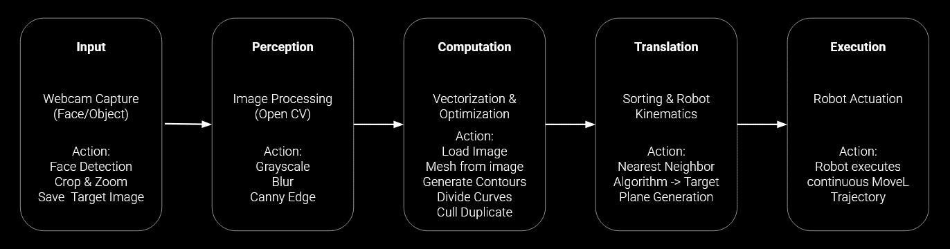 This workflow outlines a complete pipeline that transforms visual input into a continuous robotic drawing. It begins with Input, where a webcam captures a face or object and performs detection, cropping, and target image saving. In the Perception stage, the system applies image processing techniques in OpenCV grayscale conversion, blur filtering, and Canny edge detection to extract meaningful structural information. During Computation, the image is vectorized and optimized by generating contours, dividing curves, removing duplicates, and preparing a drawable mesh. The Translation phase then reorganizes this geometry through nearest-neighbor sorting and robot kinematic mapping, generating a feasible target plane and motion path. Finally, in Execution, the robot actuates a single continuous movement trajectory, physically materializing the processed vision without lifting the drawing tool, closing the loop between perception, computation, and embodied action.