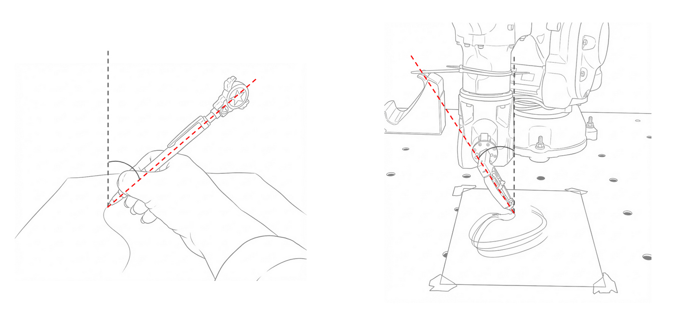 To achieve fluid simple strokes, the robot’s end-effector is programmed to mimic the natural human drawing angle of 45° to 60°.