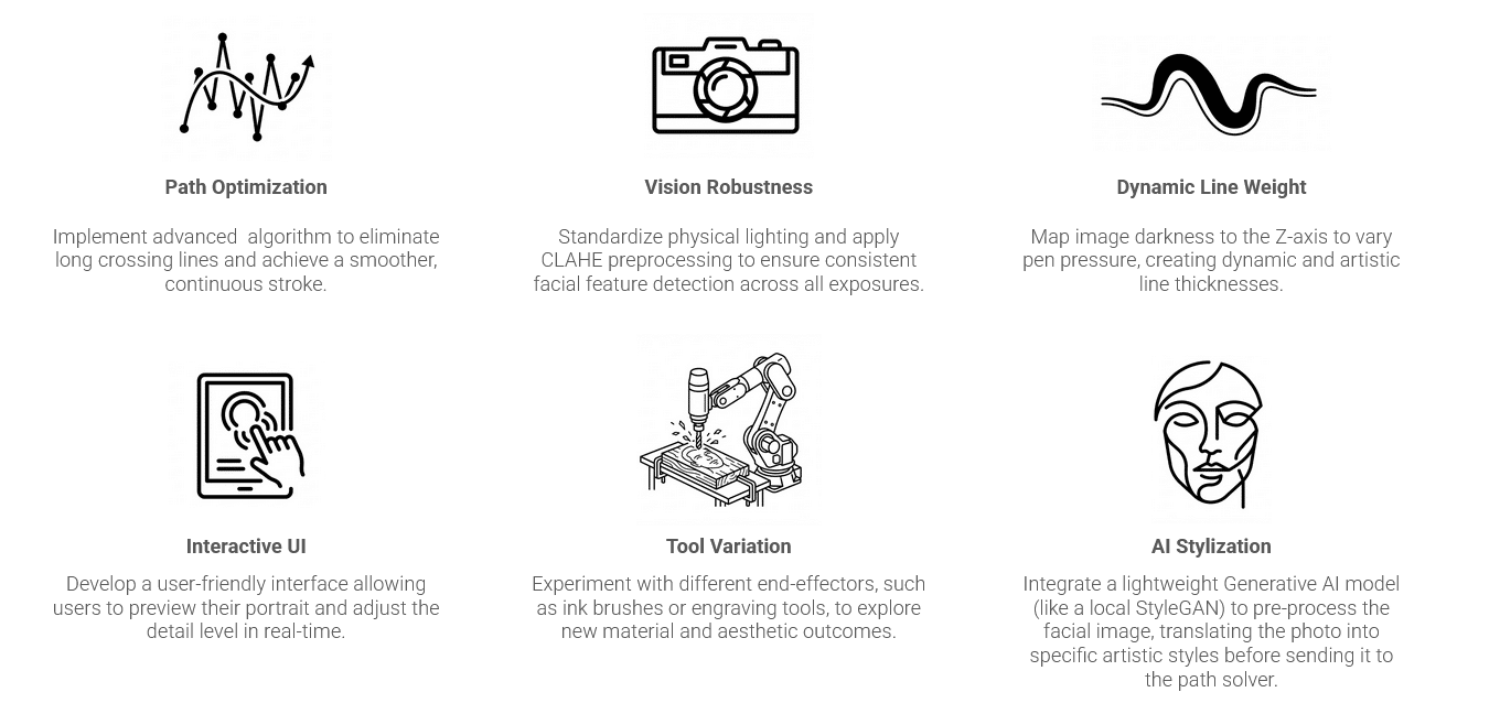 Moving forward, the project focuses on enhancing both technical precision and artistic expression. Path optimization algorithms will be refined to reduce unnecessary crossings and produce smoother, more efficient continuous strokes. Vision robustness will be strengthened through standardized lighting conditions and advanced preprocessing techniques such as CLAHE to ensure consistent facial feature detection. To expand expressive potential, image darkness can be mapped to the Z-axis, enabling dynamic line weight through controlled pen pressure. An interactive user interface will allow real-time preview and detail adjustment, making the system more intuitive and participatory. Additionally, experimenting with different end-effectors such as brushes or engraving tools will open new material possibilities. Finally, integrating a lightweight generative AI model for stylistic preprocessing will enable the transformation of portraits into distinct artistic interpretations before path computation, deepening the dialogue between computation and creativity.
