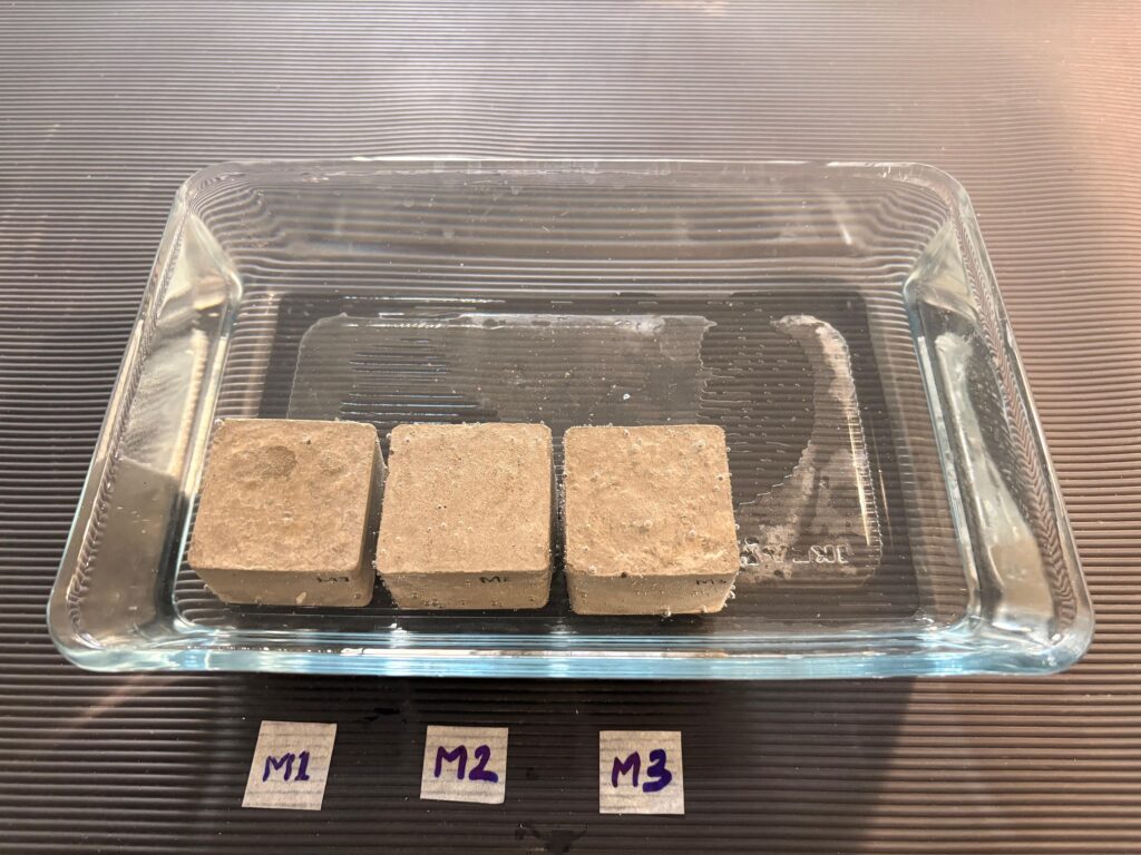50 mm cube specimens, water-bath-cured at 20 ± 2 °C, cast against mix designs issued through the kernel.