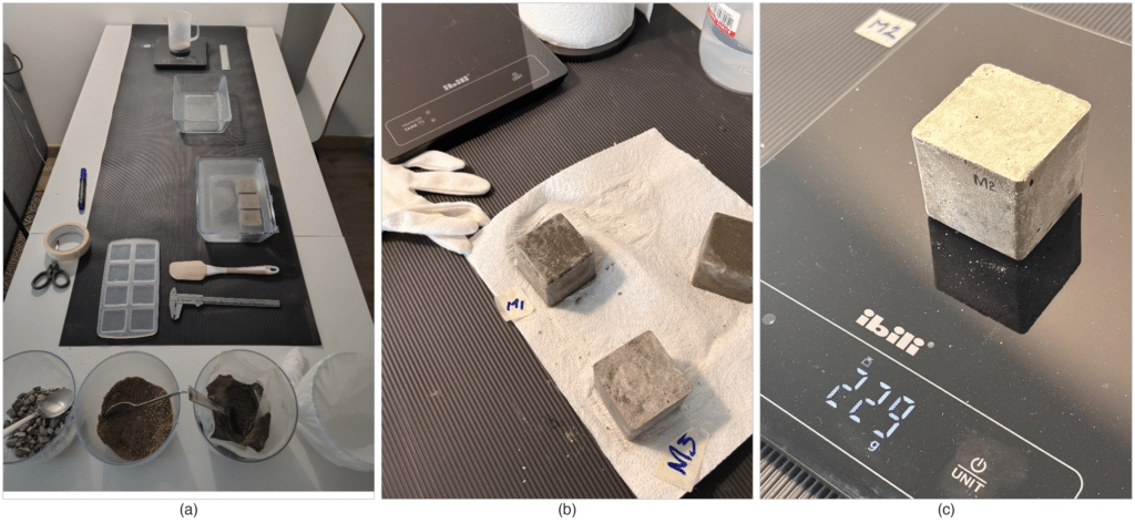 - Mass conservation. Nothing leaves or enters the control volume silently; every kilogram of binder, water, and aggregate is accounted for.