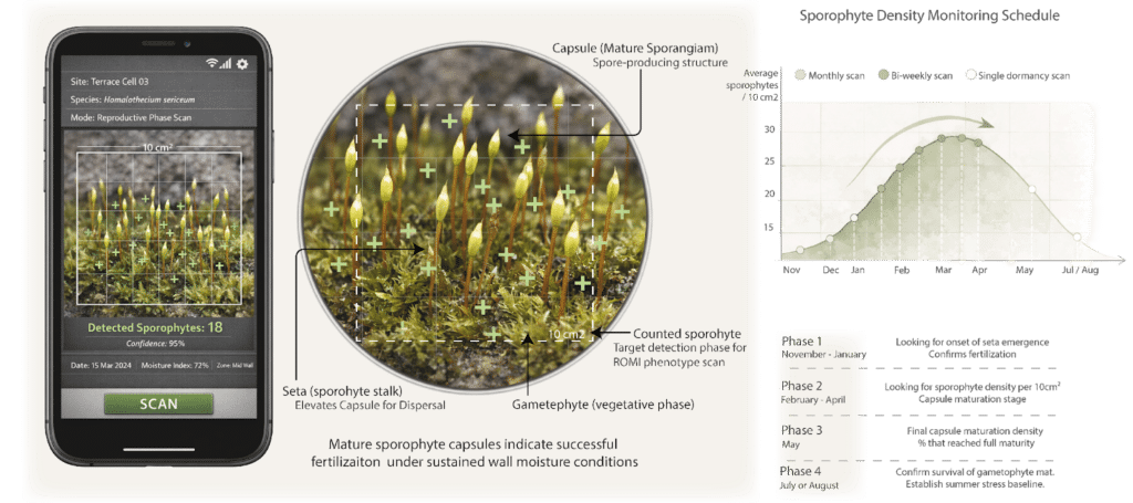 Using LiDAR-enabled ROMI phenotype scanners in connection with their cell phones, residents scan fixed 10 cm² plots within selected terrace cells. These scans measure sporophyte density as an indicator of sustained wall moisture and successful fertilization cycles.