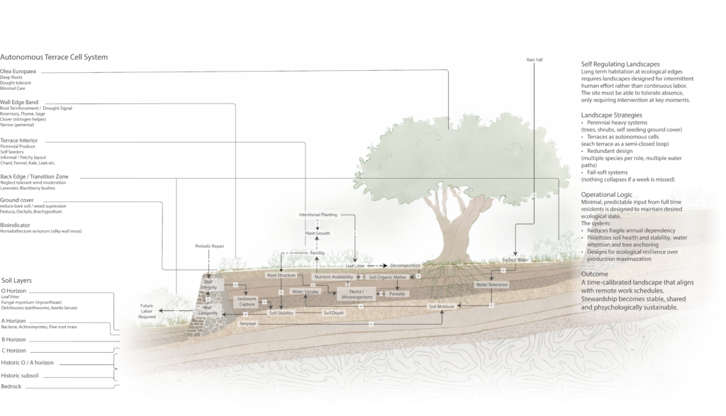 The system shifts toward perennial structures – trees, shrubs, and self-seeding ground cover – organized as semi-autonomous terrace cells with built-in redundancy.