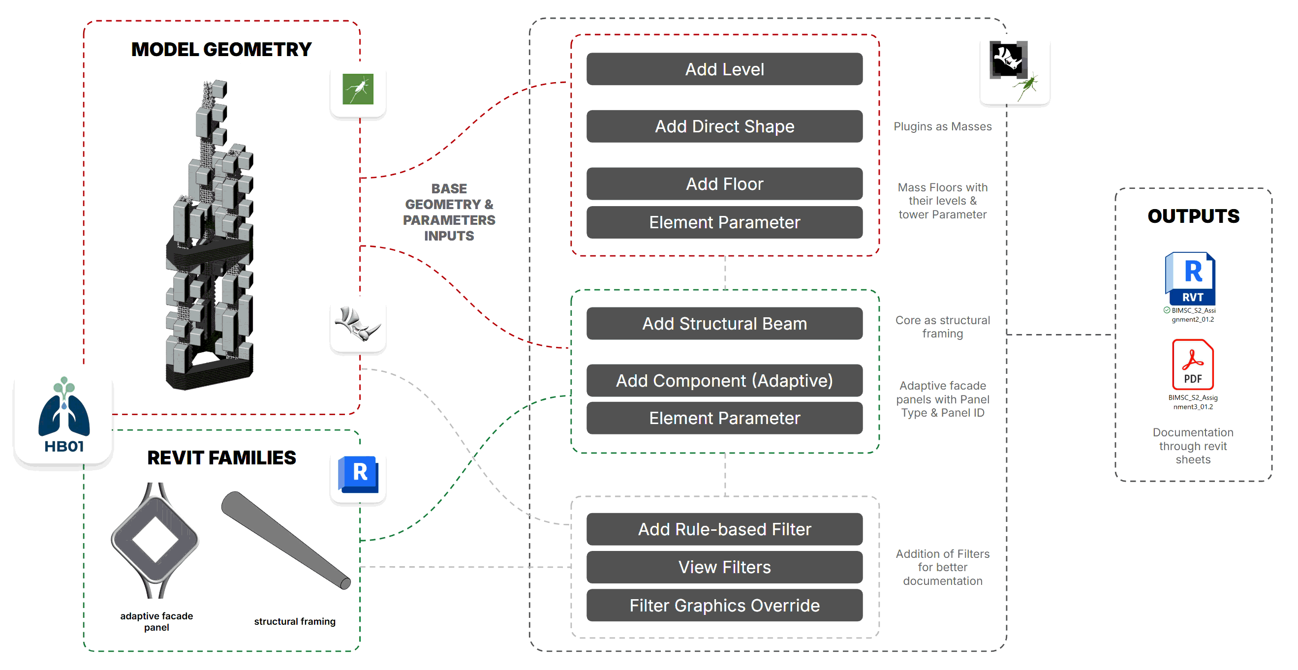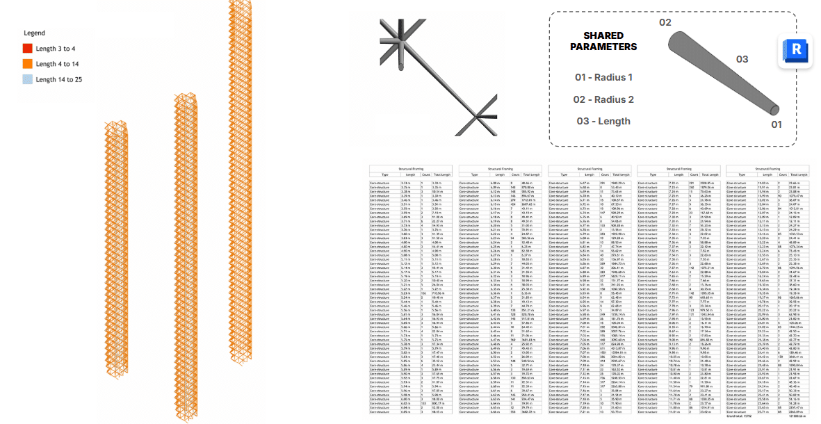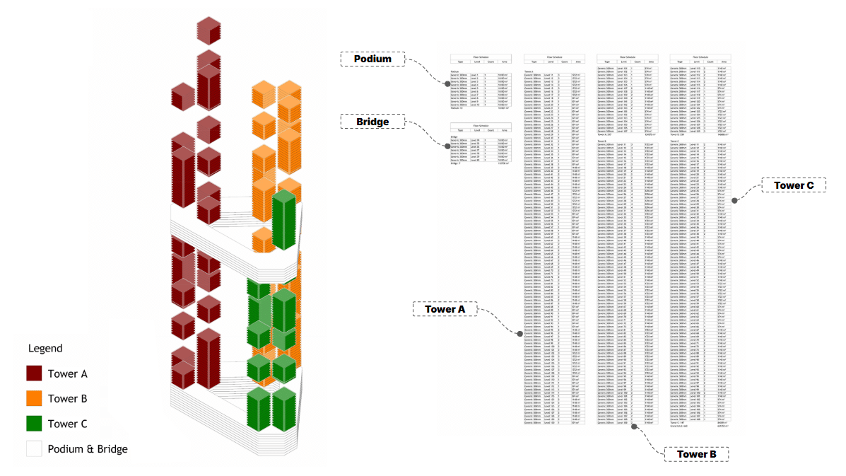 Our technical workflow uses the HB01 script to bridge Grasshopper with Revit. We translate base geometry into specific Revit families, including structural framing for the cores and adaptive facade components. To manage the complexity, we implemented parameters that categorizes elements by tower and function. By using rule-based filters, we’ve automated our documentation to ensure high-quality and synchronized outputs.