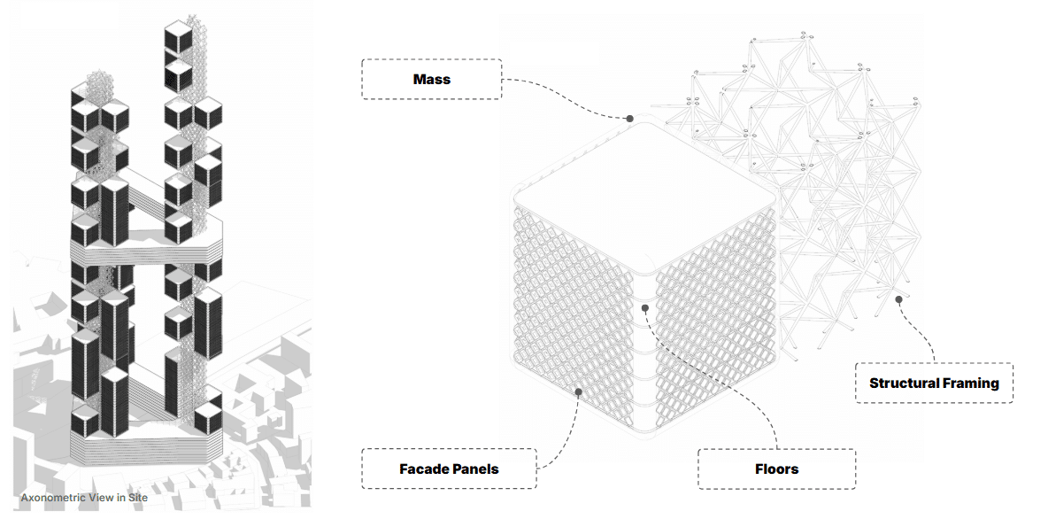 Looking at this axonometric view, you can see how these systems converge. We have the Structural Framings providing the backbone, the Floors providing program space, and the Facade Panels wrapping the volume.