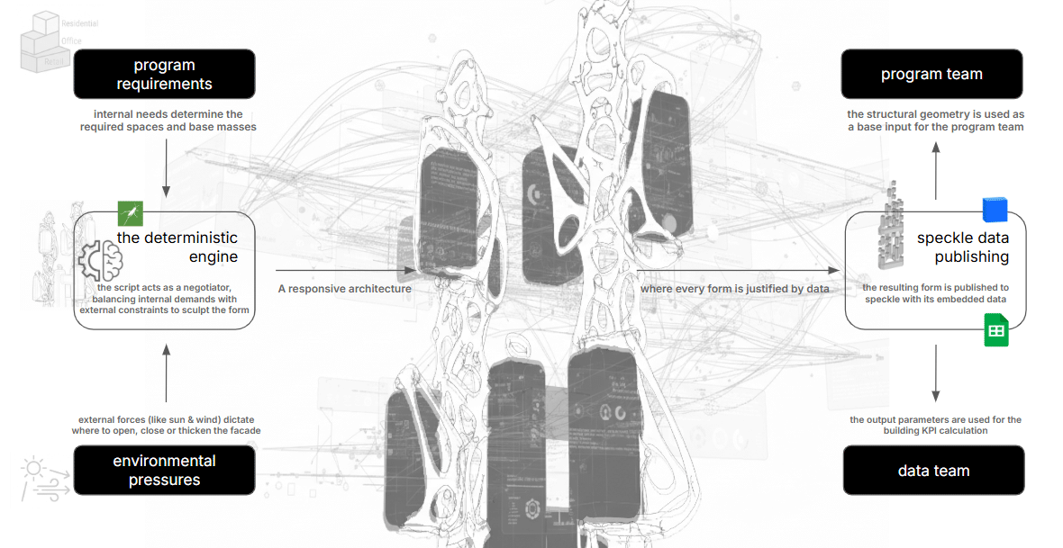 To translate this concept into a working hyper building, we are implementing a data-driven deterministic engine. where every form is justified by data. Our process is a negotiation between the Program Requirements, the Environmental Pressures and the generative script that acts as the final negotiator.
