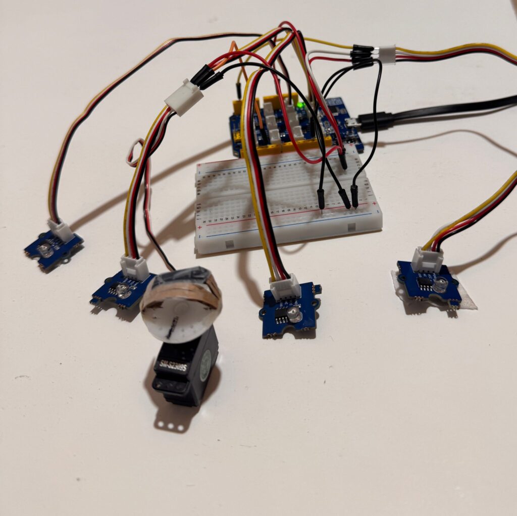 We built an interactive kinetic pavilion that literally turns toward the light. At its heart the piece uses four light sensors (LDRs) arranged around a central mount and a single servo motor. The sensors constantly measure brightness from different directions; the motor then rotates the structure smoothly toward whichever sensor detects the strongest light. What looks simple on the surface a motor following a bright patch is actually a compact, intentional system that borrows behaviour from plants: the pavilion performs a mechanical form of heliotropism, a motion you see when flowers and leaves track the sun during the day.