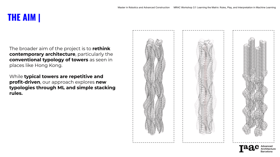This project explores the redesign of contemporary tower structures using machine learning (ML), challenging the repetitive, profit-driven design seen in cities like Hong Kong. The goal is to discover new typologies through AI and stacking rules, and tren translate them to a robotic fabrication system (pick and place). AI-generated towers were curated for stability and aesthetic character before being realized through robotic construction techniques.