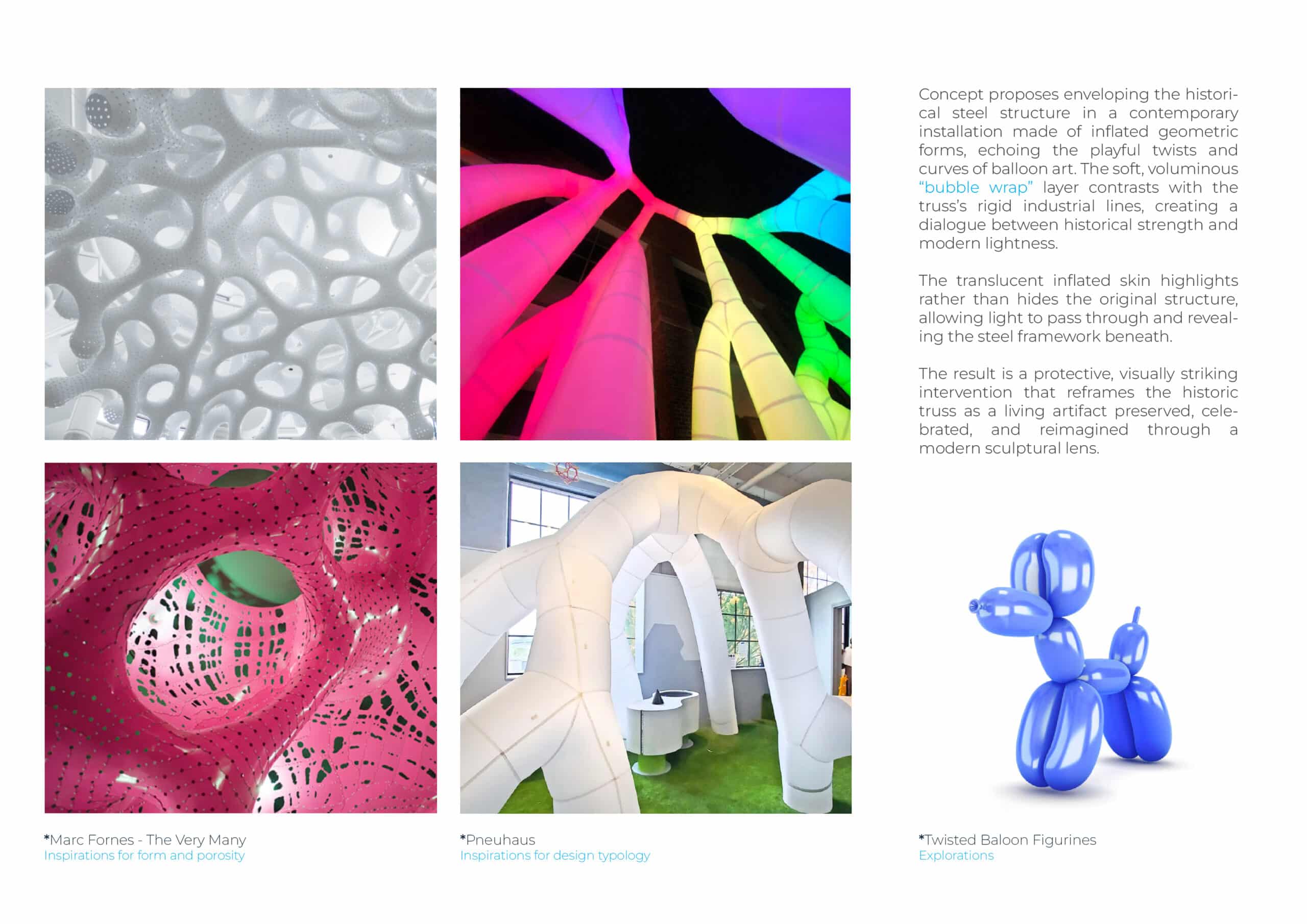 The Project explores a contemporary dialogue between past and present by enveloping a historic steel truss within a soft, inflated architectural skin. Inspired by the playful curves and buoyancy of balloon art, the installation introduces a layer of translucent, geometric “bubble wrap” forms that gently overgrow the rigid industrial structure beneath.