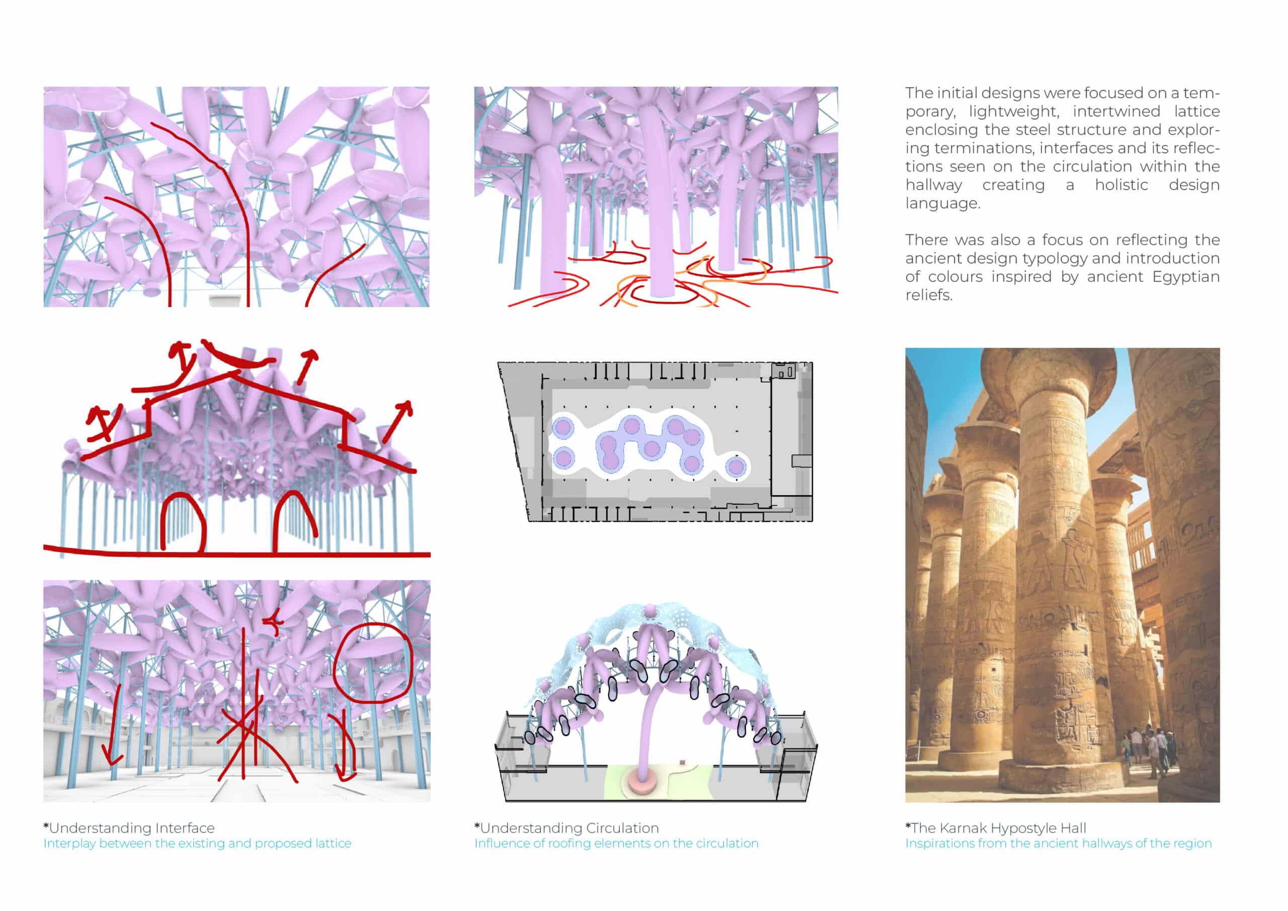 The initial design explorations focused on creating a temporary, lightweight lattice that intertwines with and encloses the existing steel structure. This early framework investigated terminations, interfaces, and moments of connection, as well as how the forms and patterns are perceived along the hallway’s circulation—helping establish a cohesive and immersive design language.