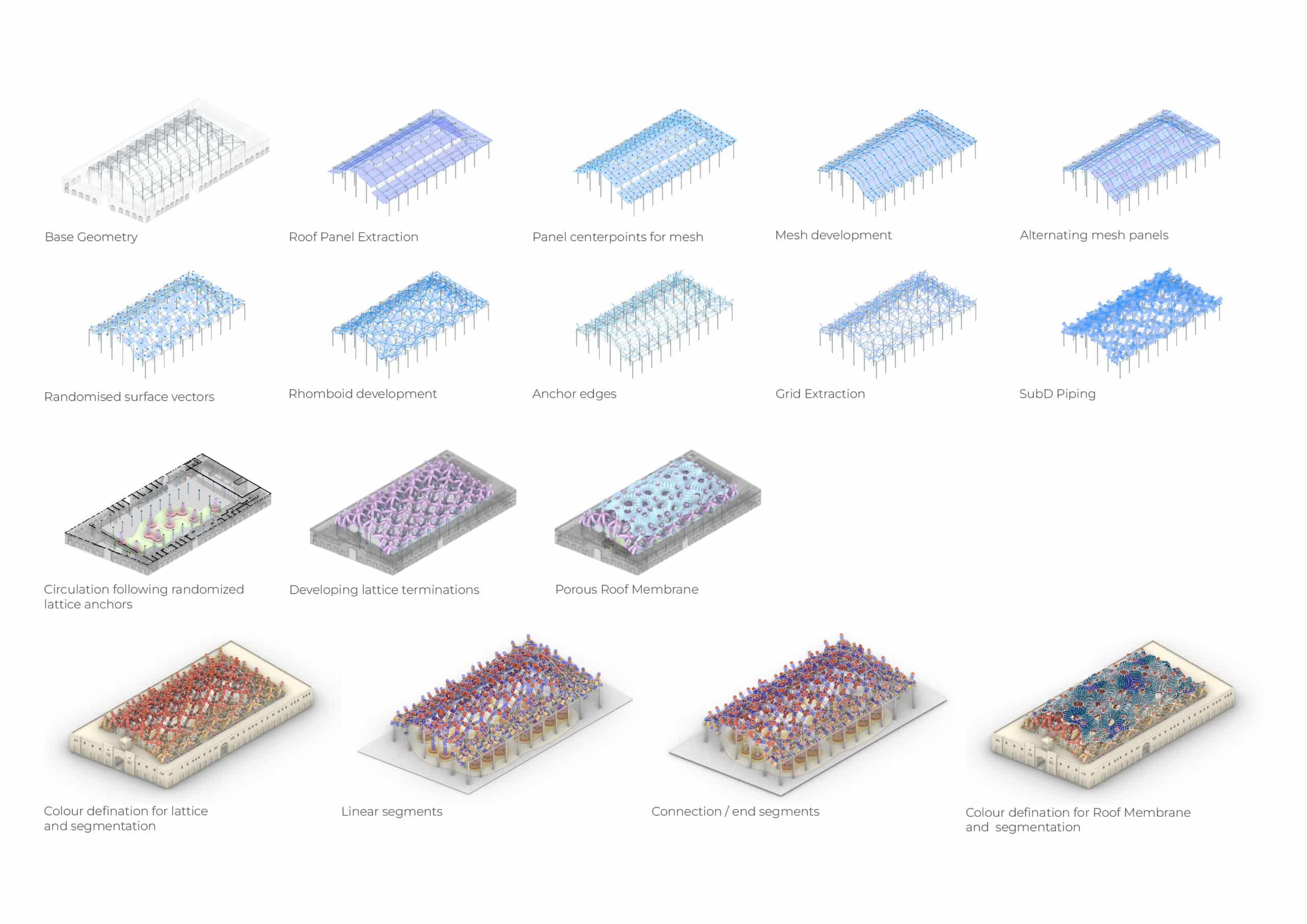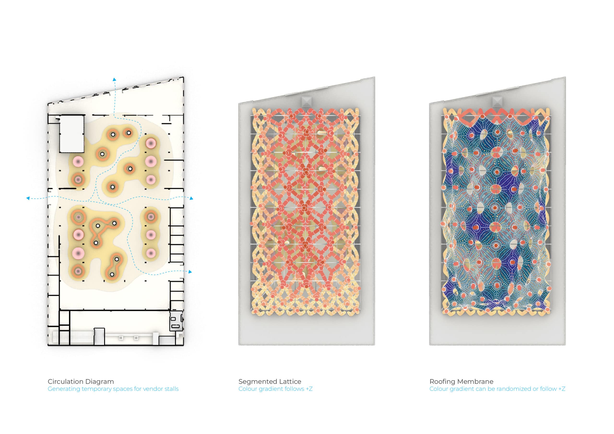 The form finding process uses the roof paneling extracted from given geometry , using the centroids of the panels to build a separate mesh which is checkered to create a set of rhomboids on the upper and lower faces of the roof, an extra set of randomized anchors are created to form termination points both as ground anchors for vendor stall generation and separately as anchors for the roof membrane. This is followed by multipiping and inflating the final grid which is segmented for strip development then colored following the gradient either in + z direction or as per random seeding points.