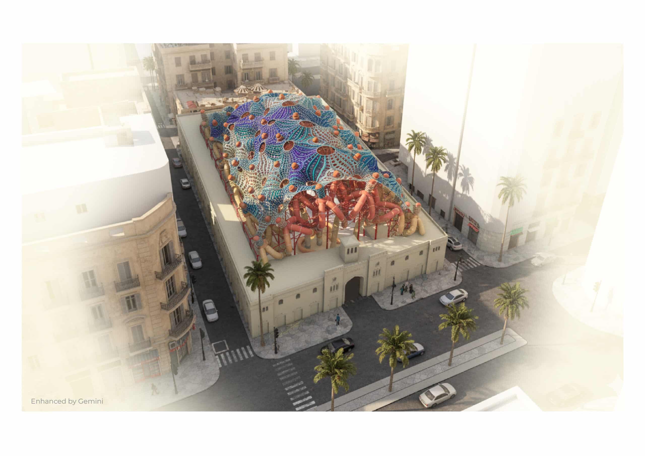 The aerial view highlights the porous roof membrane softly enveloping the colonial-era structure, showcasing its self-supporting form, the interplay of light and shadow, and the color palette inspired by historical reliefs.
