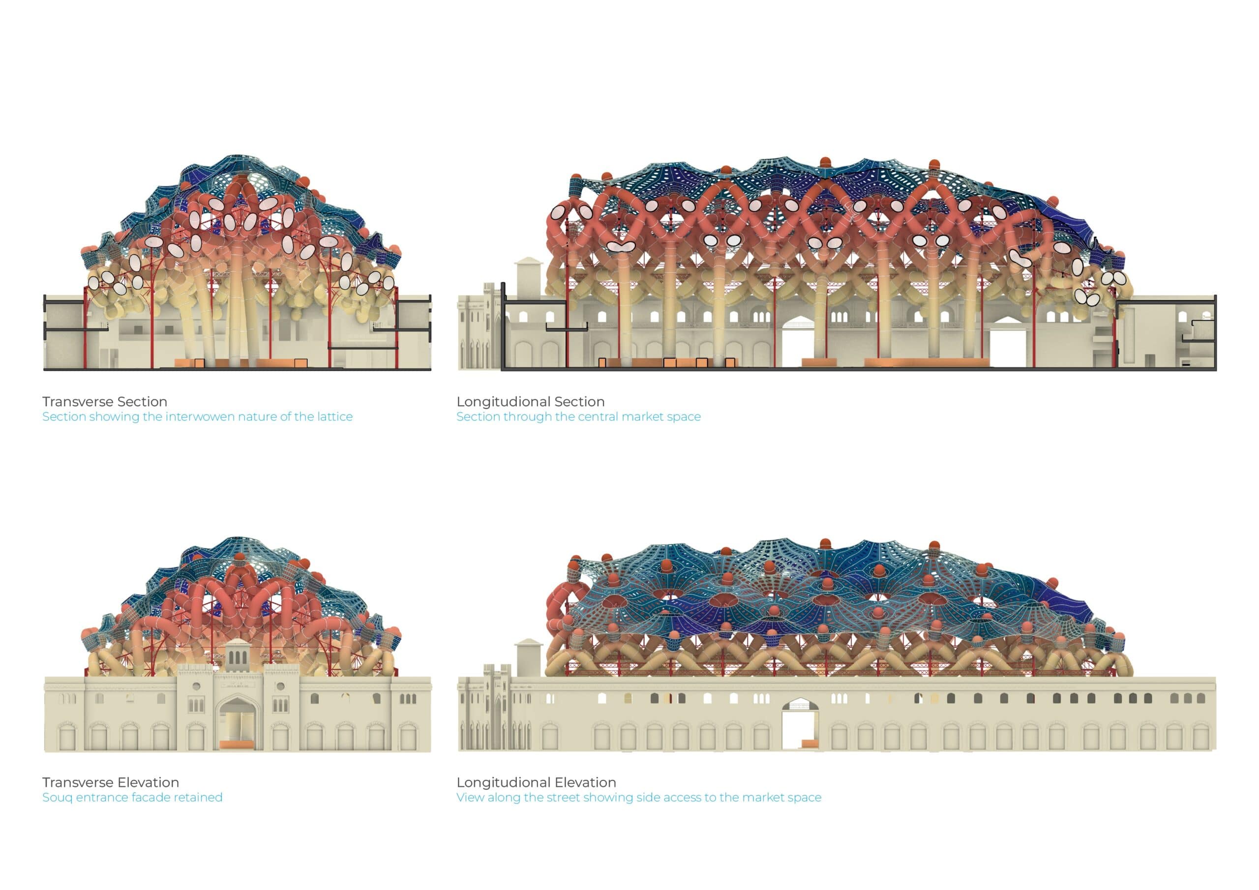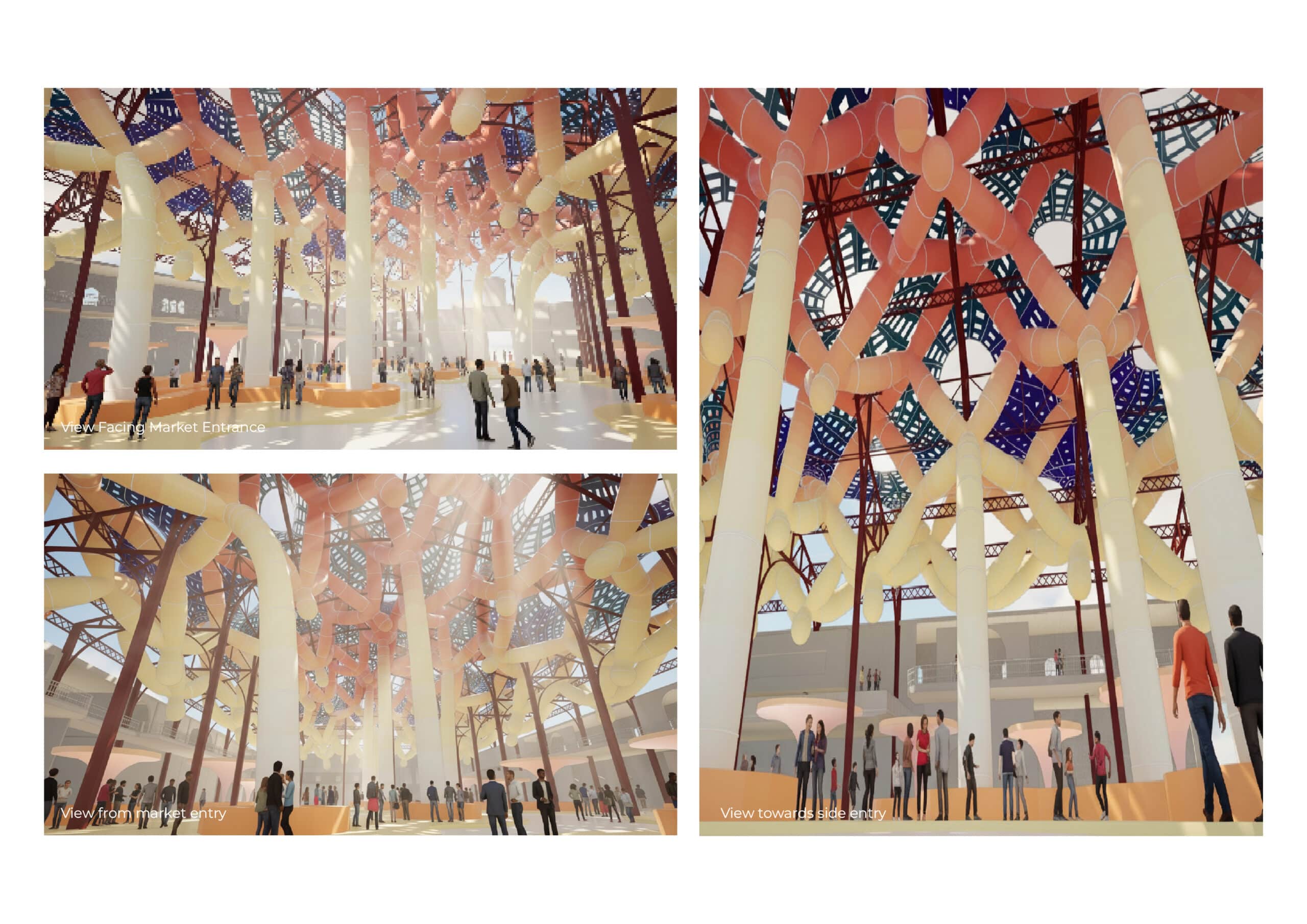 A series of renderings and sectional studies bring the proposal to life, highlighting how the inflated lattice interacts with the existing colonial-era steel framework. The images capture the dynamic light filtering through the translucent forms, the sense of movement along the interior circulation, and the spatial dialogue between old and new. These visualizations emphasize how the design explores material innovation, structural ingenuity, and historical layering, presenting a contemporary interpretation that both protects and animates the historic truss.