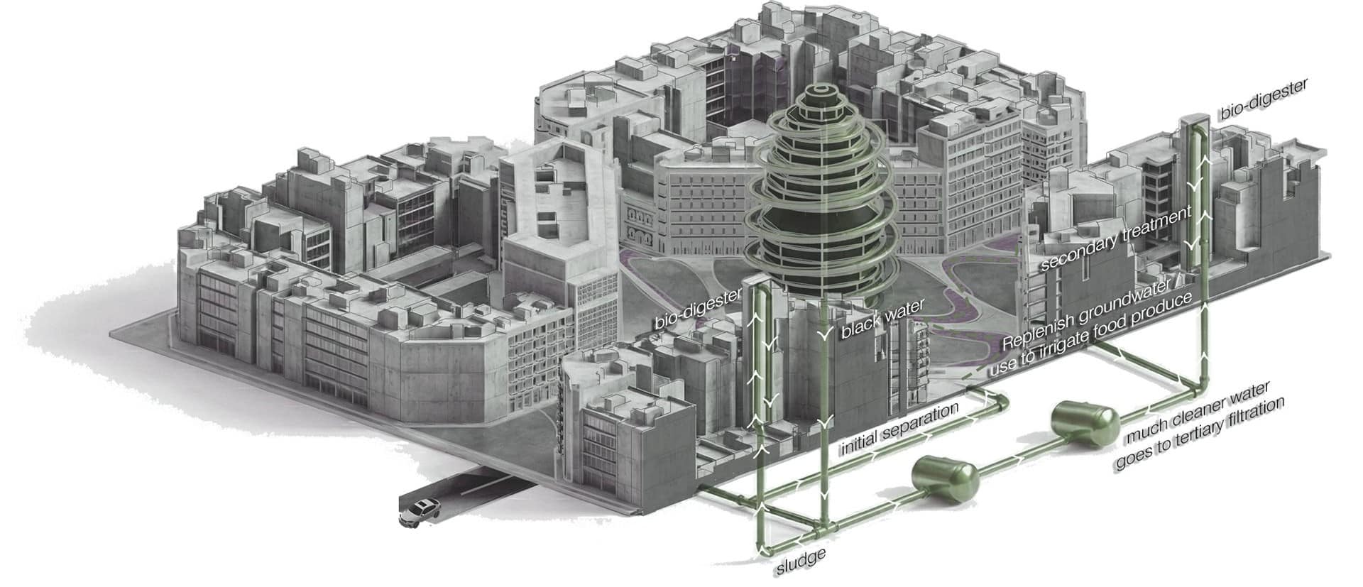 System diagram illustrating the bio-digester network, located within the inner courtyards of the blocks and connected through an underground infrastructure. Organic waste and blackwater are collected, separated, and treated on-site, producing compost and treated water that are redistributed back to the soil and food systems. The diagram emphasizes how decentralized bio-digesters operate as a hidden layer, linking housing, courtyards, and public space into a single circular system.