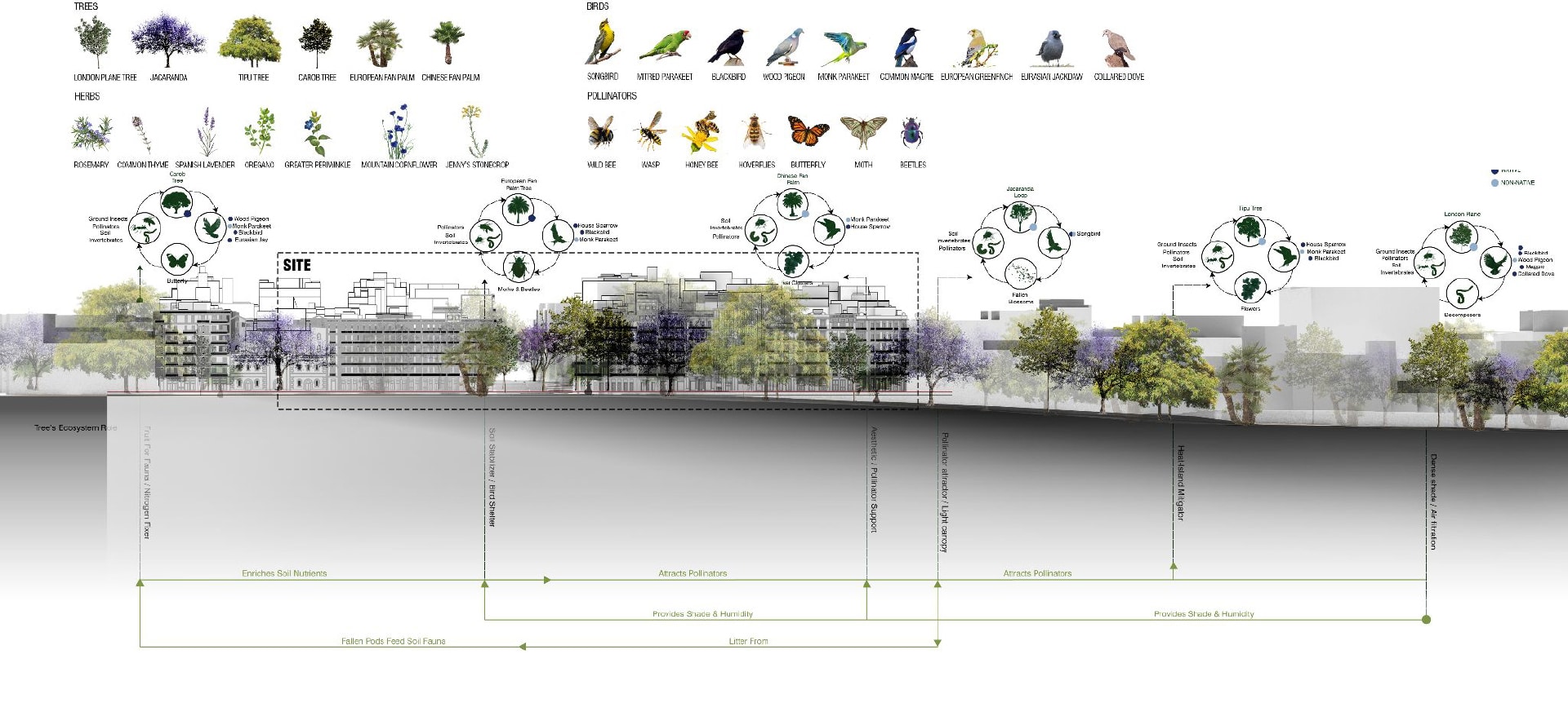 Pollinators, in turn, sustain higher species such as birds and urban fauna, which contribute to seed dispersal and population control. Together, these species form a continuous ecological chain that depends on water availability, and climatic stability. Fragmented vegetation breaks down this process. When permeability, water cycles, and habitat continuity are restored, humans become part of the ecological loop.