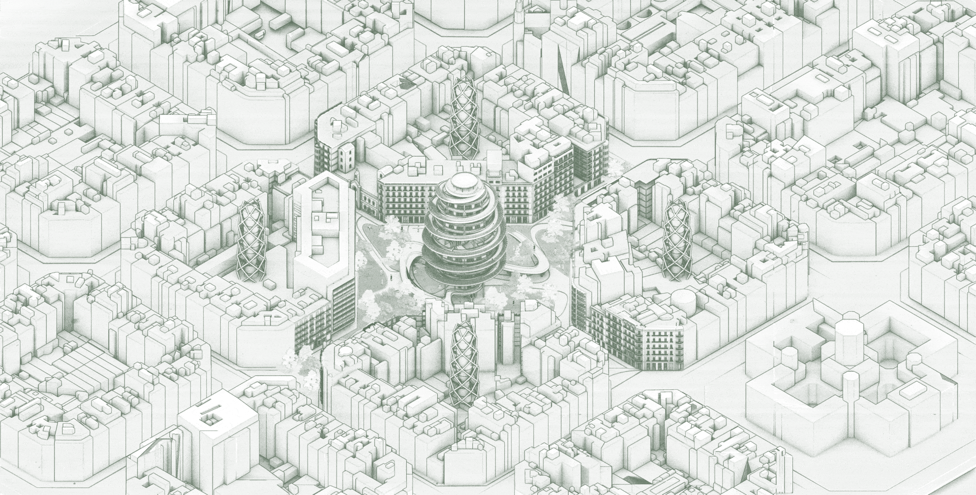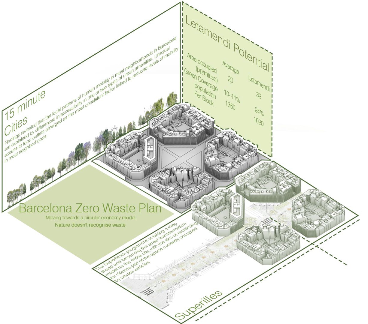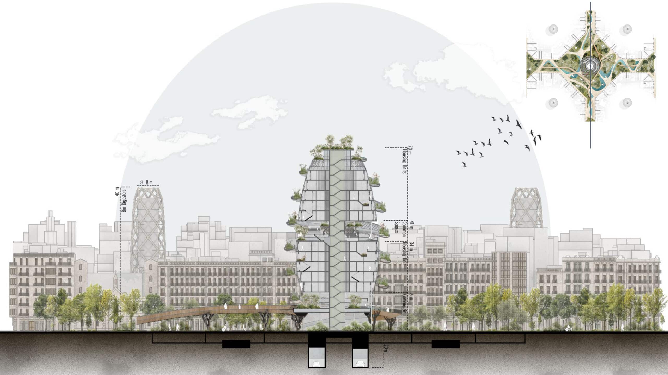 In this axonometric view, we are highlighting the project’s key components: elevated housing, multi-level public plazas, a continuous green spiral path, food gardens, bio-digestion infrastructure, and underground traffic, all integrated within the Eixample block system.