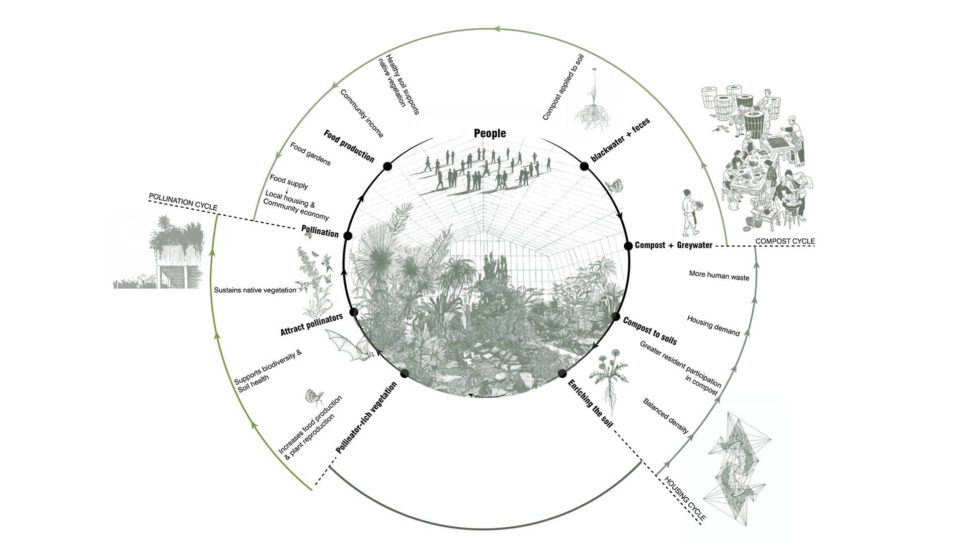 The project operates as a closed-loop system where social, ecological, and infrastructural processes reinforce one another. Human activity generates organic waste and greywater, which are treated and transformed into compost and resources for the soil. Regenerated soil supports vegetation and pollinators, enabling food production and improving environmental conditions. This food and improved habitat directly benefit residents, strengthening local housing and community life.