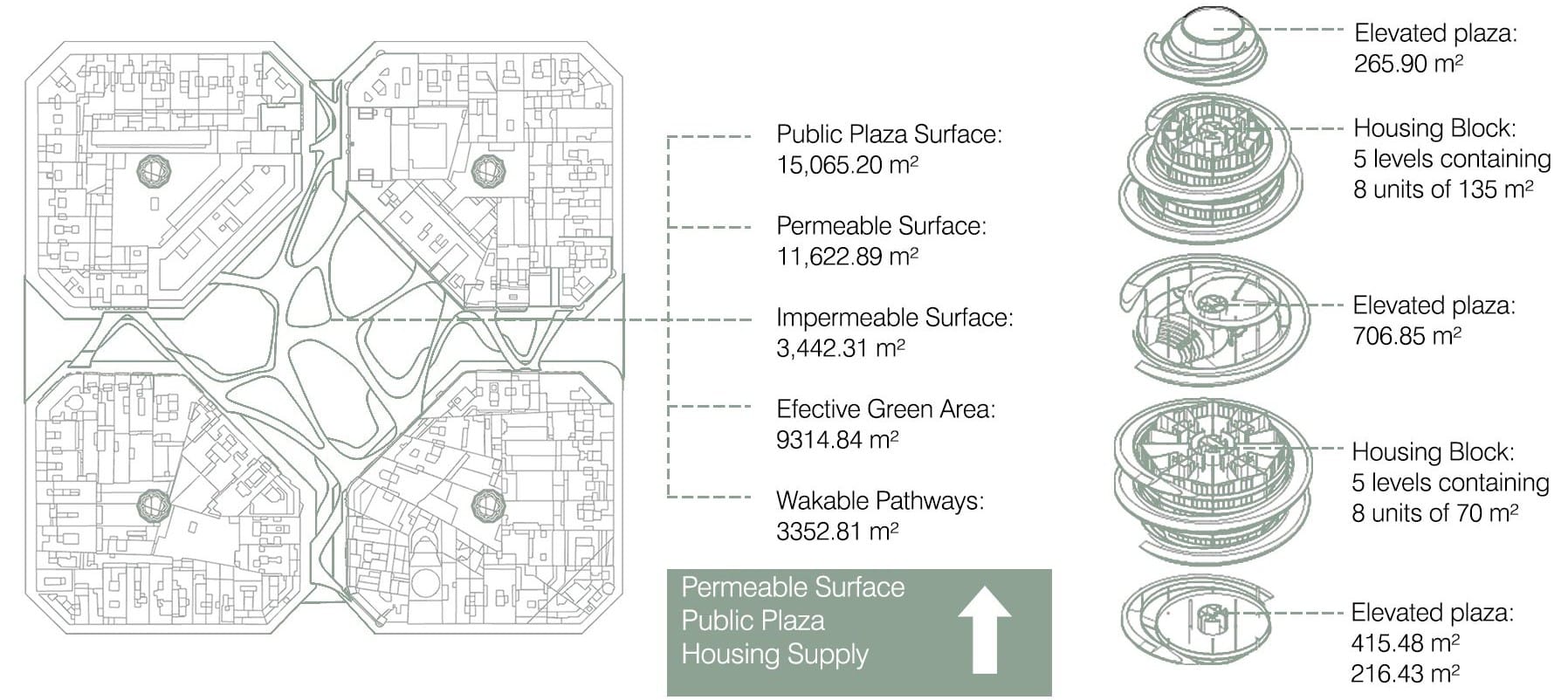 At the same time, public space is not only preserved but expanded. The plaza is recovered at ground level and multiplied vertically through elevated public platforms, increasing accessible public area without consuming more land.