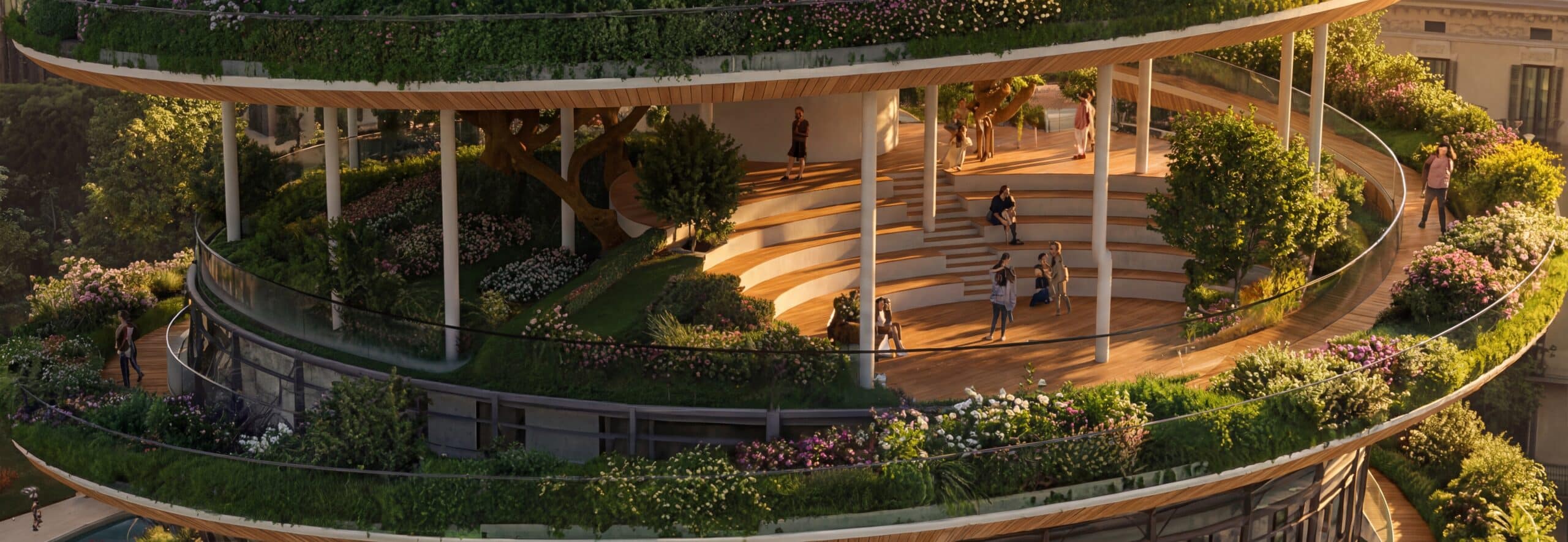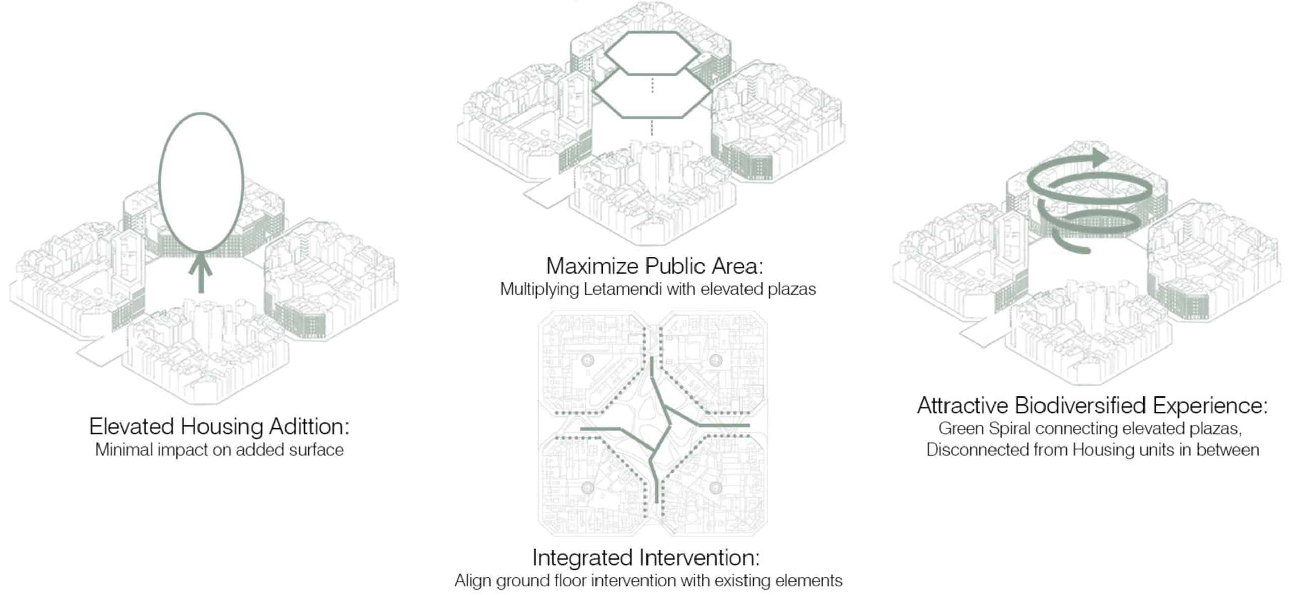 The public space is not only recovered but multiplied through a system of elevated plazas at different levels, extending the square vertically. These plazas are connected by a continuous green spiral that offers an attractive, biodiverse path, fully separated from the housing units to avoid intrusion. Housing maintains its own independent vertical circulation.