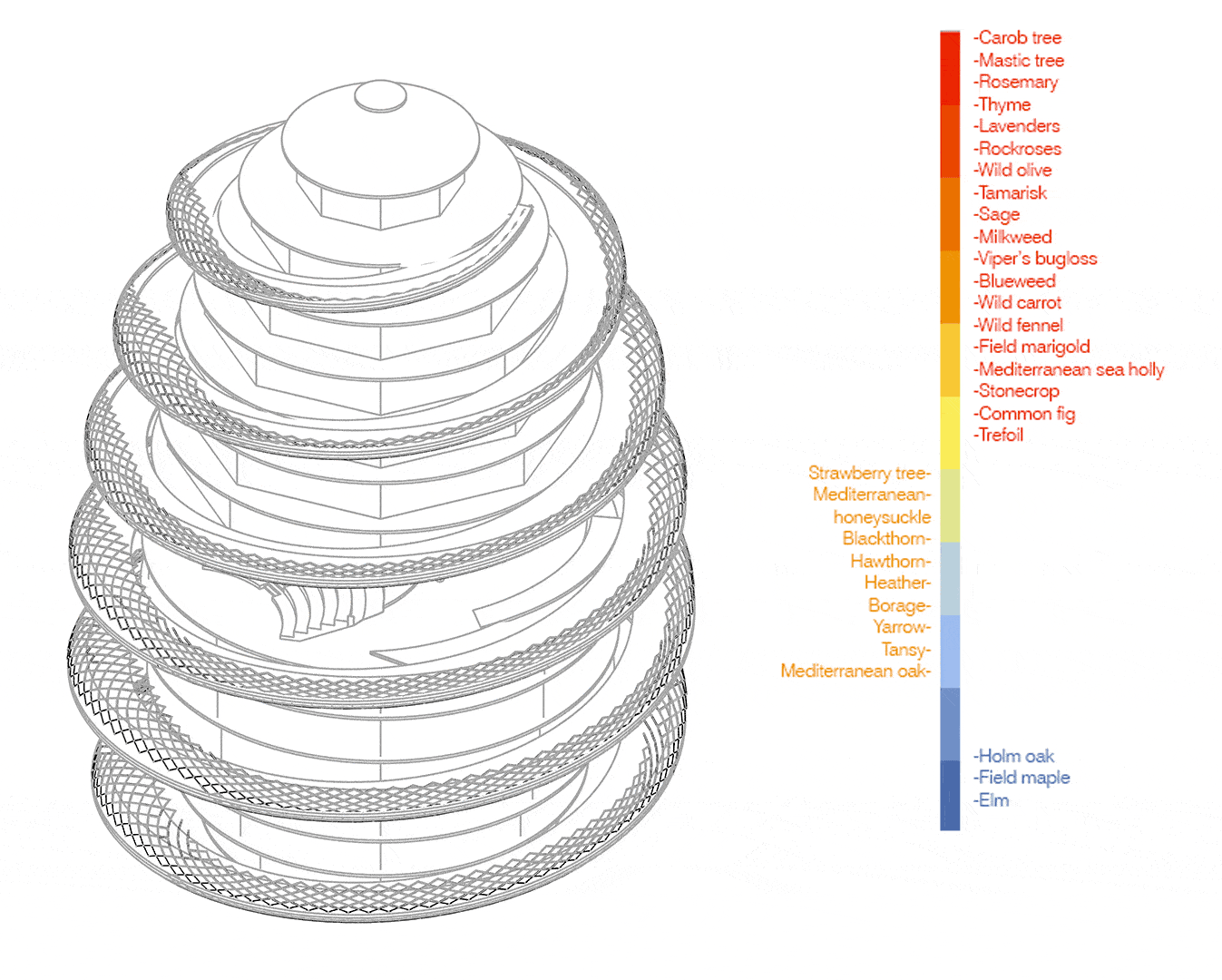 Since we planned to establish greenery on the façades, ramp and floor plates, we ran sun analysis to guide the placement of different species. The species list on the right is grouped by sun exposure needs (high / medium / and low exposures).