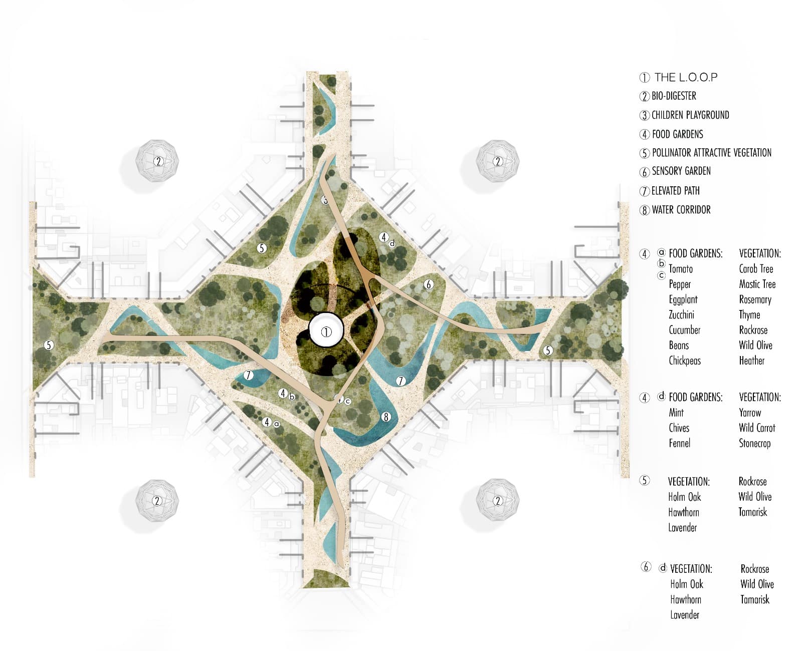 Water is then integrated as a connective element, creating a continuous blue corridor that supports soil regeneration and microclimatic regulation. Finally, vegetation and food gardens are layered along these paths, turning circulation into productive ecological infrastructure.
