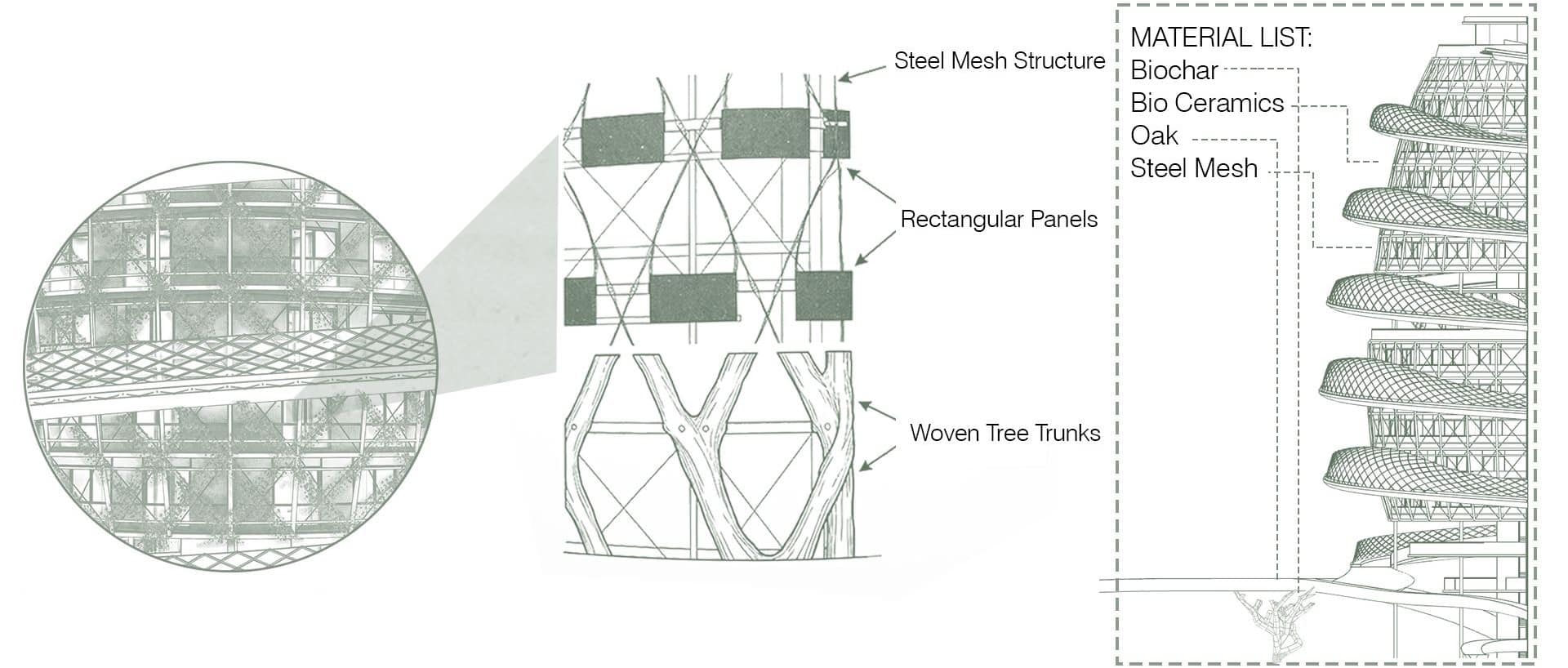 Facade system diagram illustrating a layered envelope that provides privacy through a permeable, vegetated filter. The system combines steel mesh, bio-ceramics, wood, and woven natural elements to mediate light, air, and views, creating a breathable facade that protects interior spaces while maintaining a strong connection to nature.