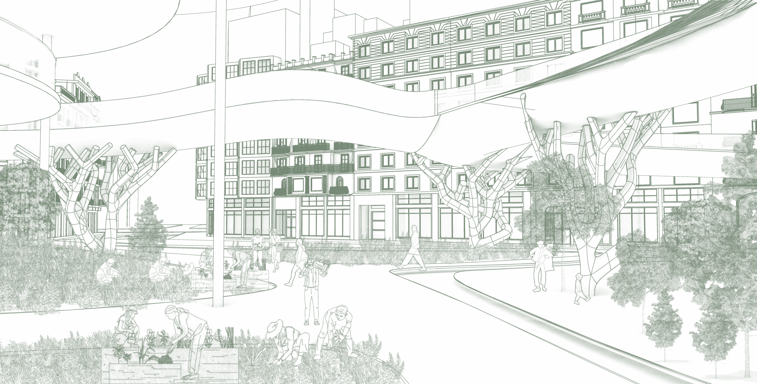 The design strategy is based on a principle of reciprocity: for everything the project takes from the city, it gives something back. Vehicular traffic is diverted underground to return the plaza entirely to public use. New housing is added, but it is elevated, minimizing its footprint and preserving ground permeability.