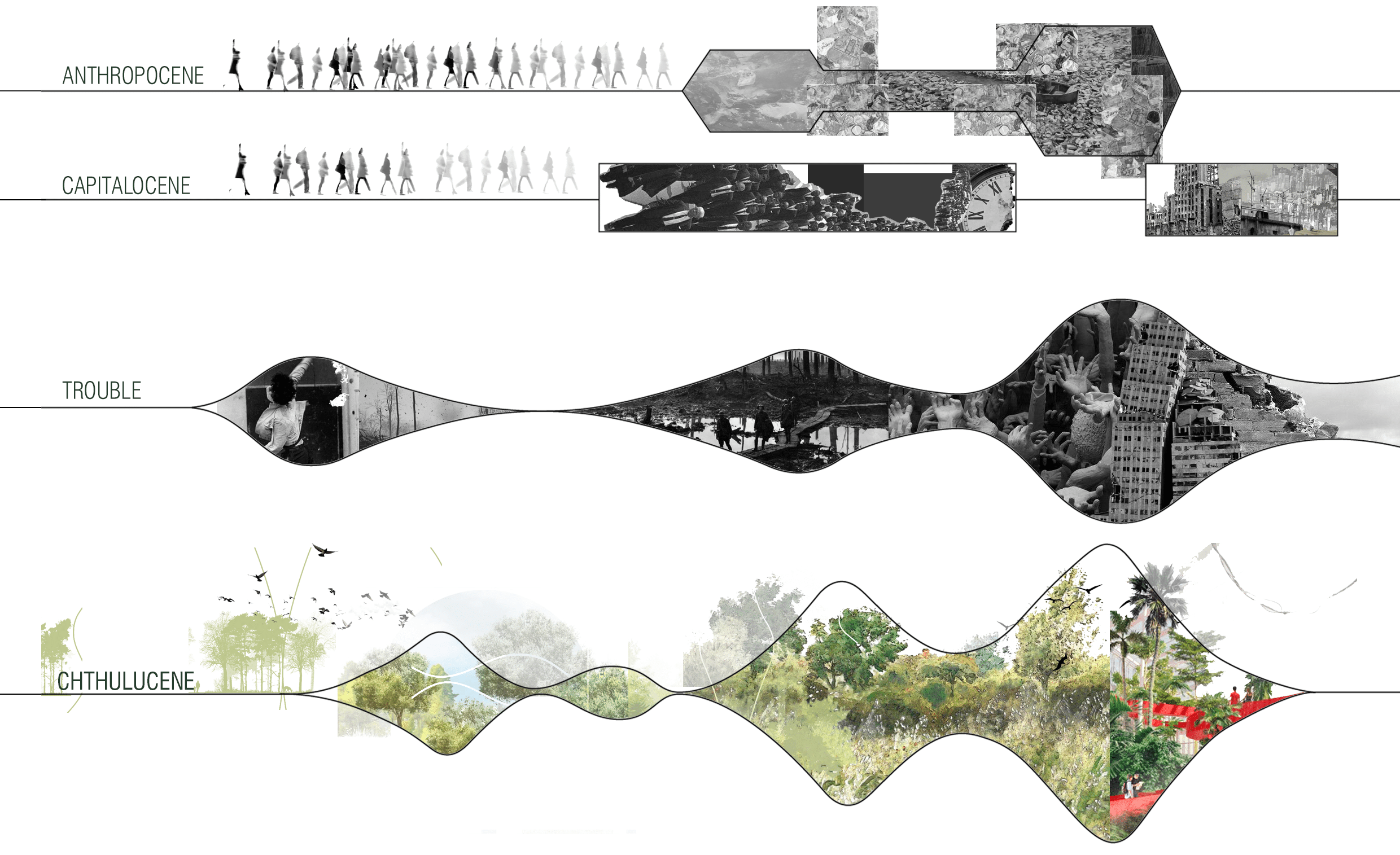 Our vision of the future is inspired by Donna Haraway’s Staying with the Trouble, which proposes a shift from the Anthropocene to the Chthulucene, a radical change where humans move away from domination and toward more inclusive, interconnected, and ecologically responsible ways of living, landing the proposal in 2075.