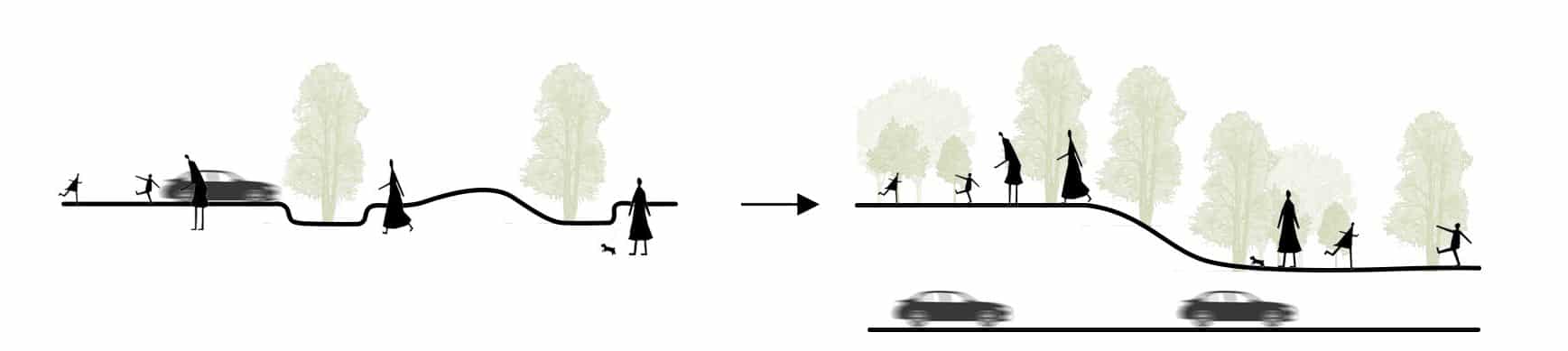 Future mobility trends point toward reduced private car use, increased shared mobility, and new logistics systems. As a result, surface streets no longer need to prioritize vehicles at their current scale. Mobility is no longer treated as a barrier, but as an opportunity to restore green space, reduce risk, and reconnect the city at ground level.