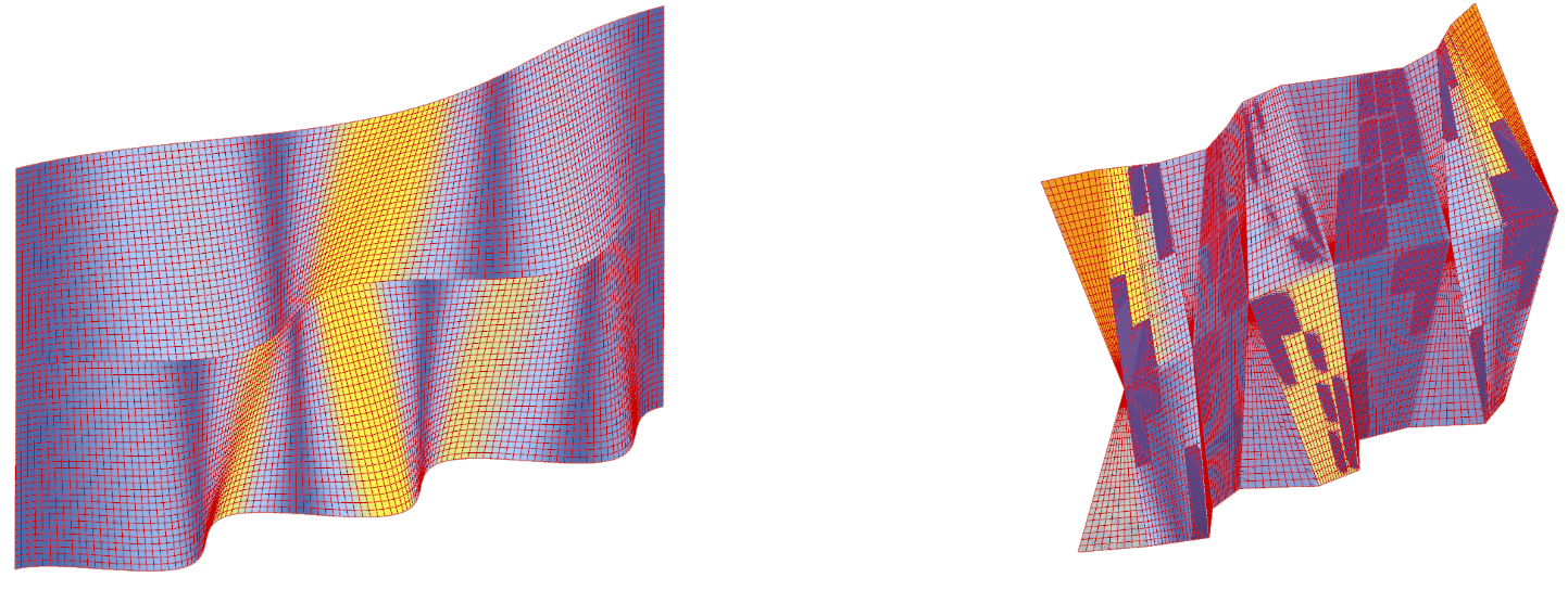 The max. angle tested was 45 degrees. From module 1 results are more stable as the surface rendered blue are less than 45 degrees and near 0 degrees angle, whereas the yellow renders show near 45 degrees and red show its leaning on to or more than 45 degrees. Module 2 shows there are areas that will lean on to or more than 45 degrees, which will be unstable. However, there are vertical lines that act as reinforcements that can hold the flat angled surfaces together.