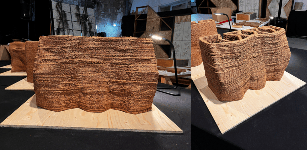 Our project for the Large-Scale 3D Printing with Biomaterials workshop focuses on the transition from conventional, high-emission construction to a circular, bio-based architectural model. Utilizing a 6-axis robotic arm, we have developed an acoustic envelope system composed of a cork-based bio-composite sourced from recycled stoppers. The research prioritizes a “File-to-Factory” workflow where computational geometry is directly informed by the physical constraints of the material paste. Instead of relying on standard geometries, we implemented a high-relief micro-textured surface designed specifically to maximize acoustic performance—addressing parameters like reverberation and sound clarity—while providing essential structural “self-bracing” to support the self-load of the wet cork during the additive process. This approach transforms carbon-negative waste into a performative architectural skin, shifting the focus from operational energy to the significant reduction of embodied carbon in the built environment.