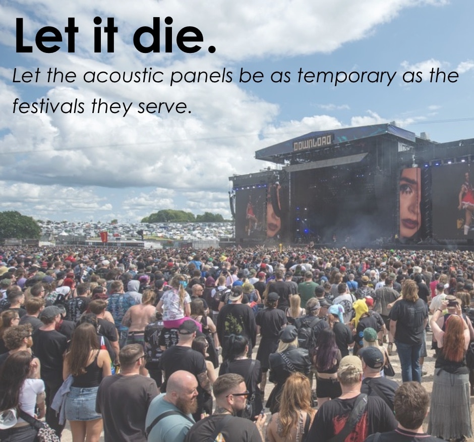 The project begins from a simple idea: not every architectural intervention needs to last forever. We wanted to create a structure that supports the acoustic and spatial needs of festivals while embracing transience as a design value. Instead of generating waste after the event, the panels are intended to be reused, disassembled, composted, or integrated into soil-based applications.