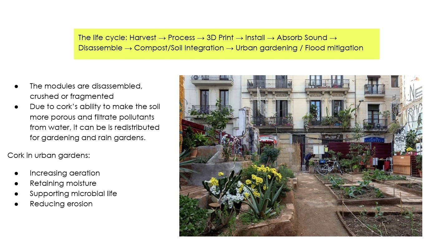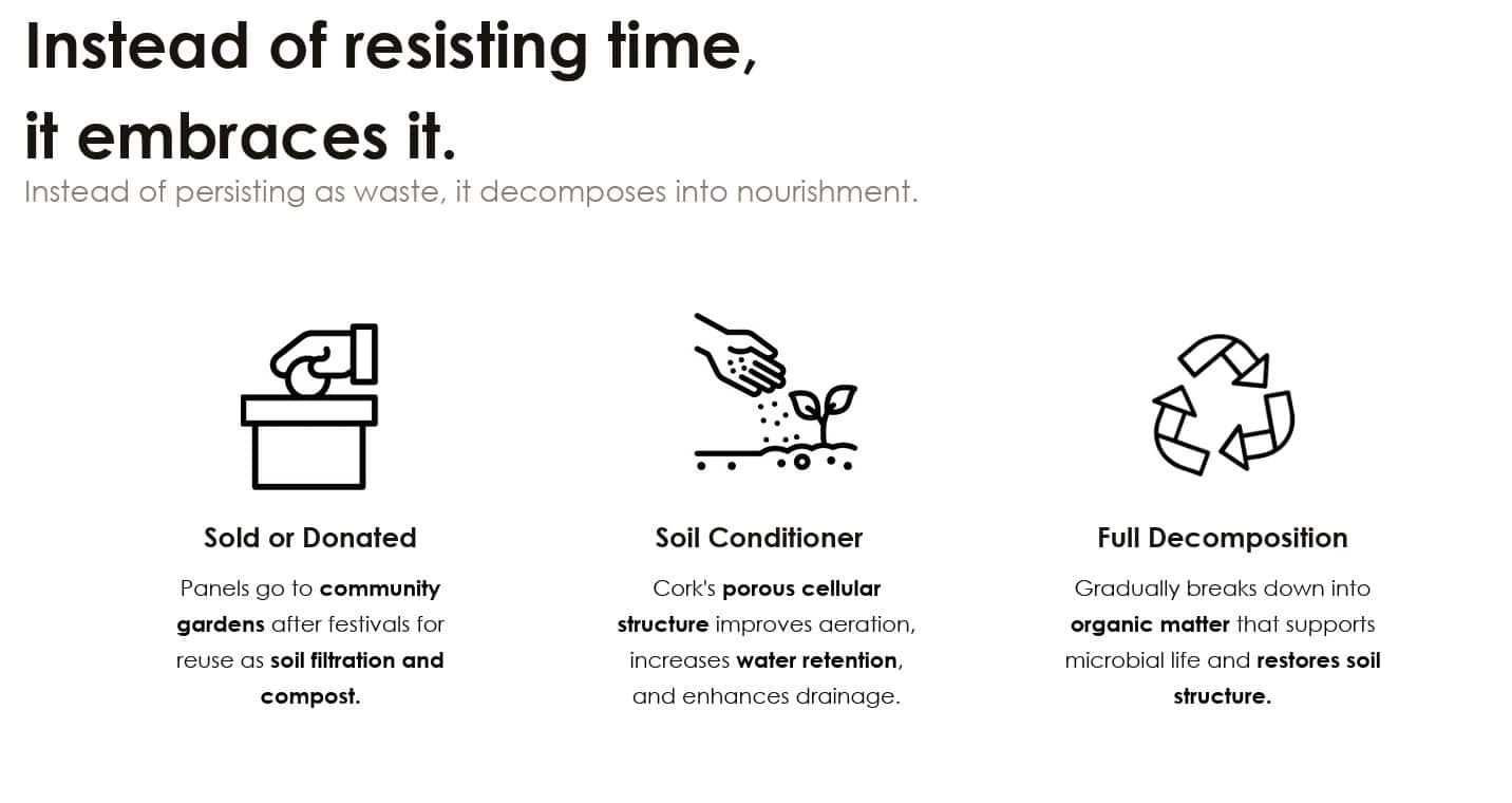 The afterlife of the panels is a key part of the design. Once the festival ends, the modules can be disassembled, crushed, or fragmented and redistributed for gardening, rain gardens, or soil improvement. Because cork can increase porosity, retain moisture, support microbial life, and help reduce erosion, the material has value beyond its initial architectural role. In this way, the project closes the loop between fabrication, performance, and environmental return.